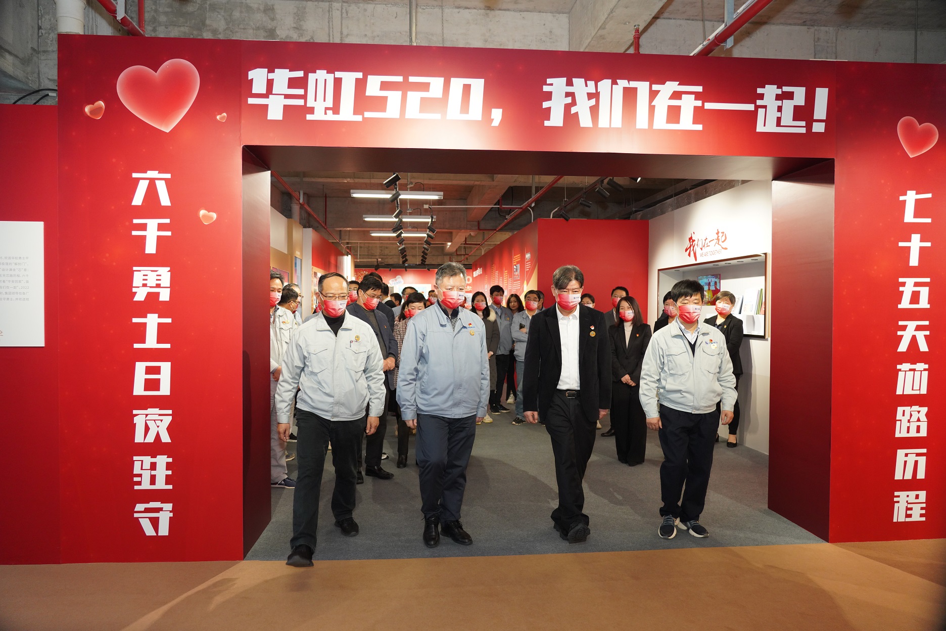 (华虹集团党委书记、董事长张素心、华虹宏力党委书记、总裁唐均君、上海华力总裁雷海波、上海华力党委副书记、执行副总裁苏国良带领职工们再次迈出“解封之门”。)