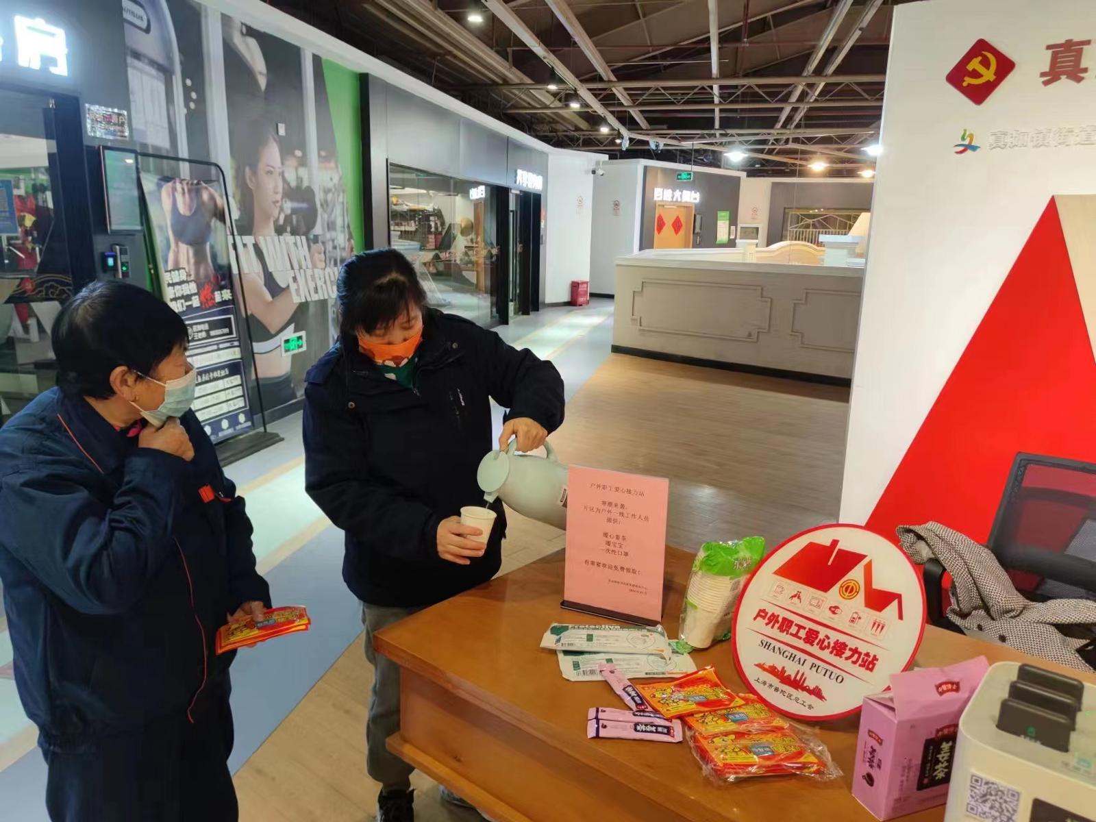 在遍布全市的户外职工爱心接力站等工会阵地,环卫工人、快递小哥、交警辅警、物业保安、家政护理员等户外劳动者们都能收到一份份来自工会的用心好礼:宝山区的四家“全国最美户外劳动者服务站点”内,有工会备好的腊八粥和慰问品;松江区广富林街道的接力站内,一个个保温杯让小哥们的冬天不再寒冷;在普陀区25家正常开放的区属站点里,正积极推广“职工公益共享药箱”等做法,除抗原、药品等,还贴心备好了暧宝宝1200余片,姜茶1000袋、洗手凝胶等;在金山区,区总工会开展“爱鑫暖茶”室外作业职工关怀项目,为环卫工人移动式配送姜茶,并向全区48家服务站点配送300份“冬送温暖”礼包,让奔走在千家万户“最后一公里”的“骑士”享受到工会组织的“冬日温暖”;在徐汇区的接力站内,小哥们不仅可以领取到防疫物资,还可以扫描心理服务二维码,获得免费的各类心理服务。