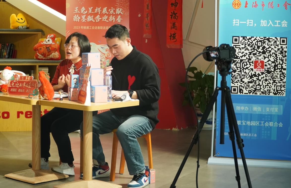 杨浦工会、幸福直通车、爱上海品上海、品质生活、温暖服务季,这些工会词滚动闪现在“杨浦职工之家”的抖音直播间里,“玉兔呈祥翰墨香”送春联送祝福活动时,职工通过参与直播互动,由主播抽取幸运观众,依次获赠春联、福字、兔年吉祥物、“杨工小囡”定制盲盒。