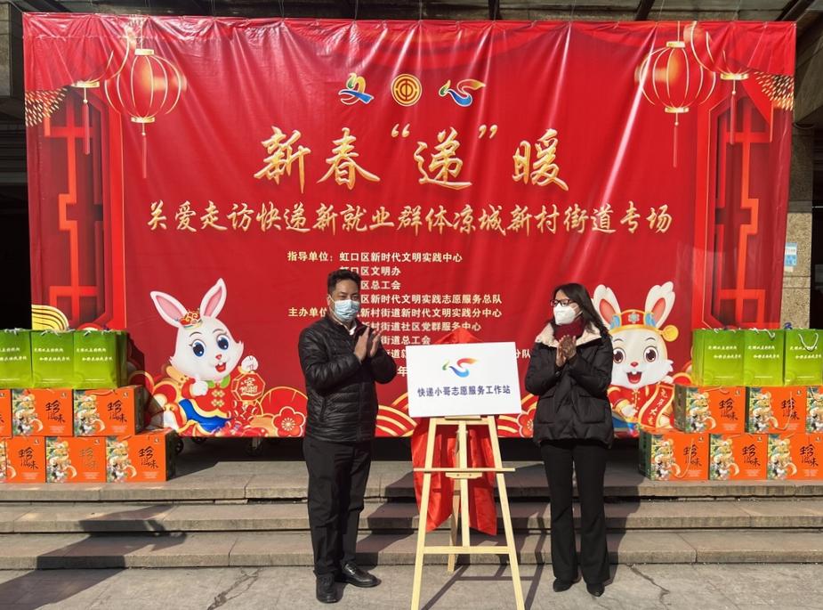 春节将至,岁寒情暖。近日,虹口区总工会、区新时代文明实践中心、区工人文化宫和凉城新村街道总工会等联合开展新就业群体慰问走访活动,“快递小哥志愿服务工作站”在顺丰快递广灵四路站揭牌成立。