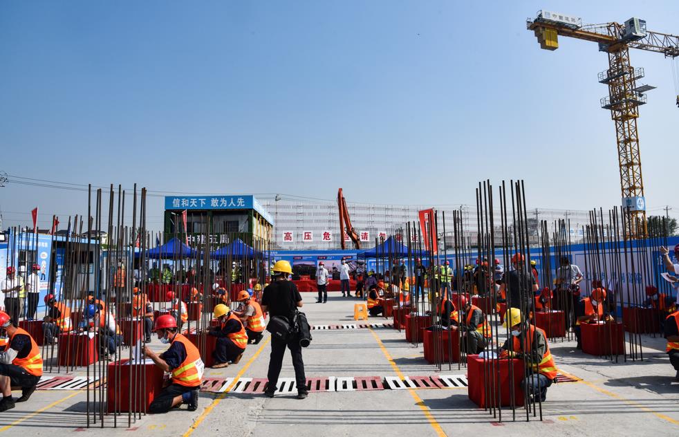 图片说明:中建五局华东公司浙江杭州良渚EPC项目工地开展钢筋工技能比武活动。■受访对象供图