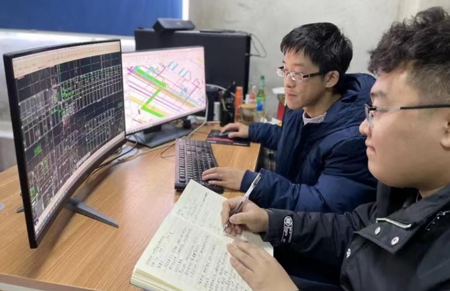 图片说明:静安工匠、中建五局BIM专家易溪(左)为加入“睿筑BIM三创工作室”的新人讲授工作要点。■受访对象供图