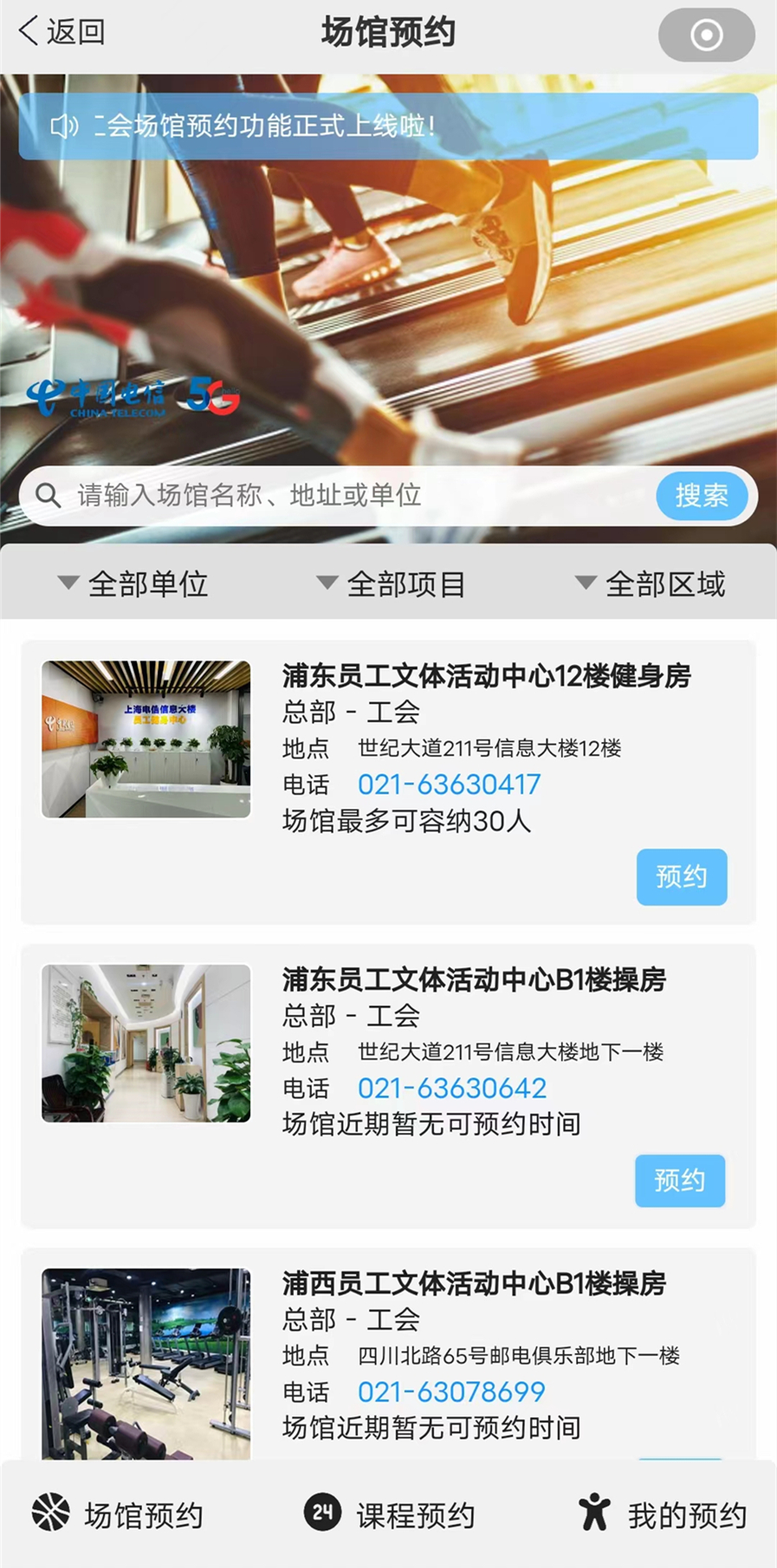 如今,伴随着文体场馆预约功能上线“随身办”(电信员工app),上海电信互联网体锻健身模式又上新台阶。记者从工会方了解到,包括信息大楼健身房、团操房,信息园区羽毛球馆,武胜大楼篮球场在内的8家场馆已上线平台,员工只需在“随身办”拇指点点,即可预约自己喜欢的场馆或课程。另有38家基层单位的文体活动中心(场馆)也会在后续梳理、整合和上线。届时,连成的上海电信“健身圈”,将实现资源互通、员工互动、文化互联,做到企业健身资源的有效共用、共享。