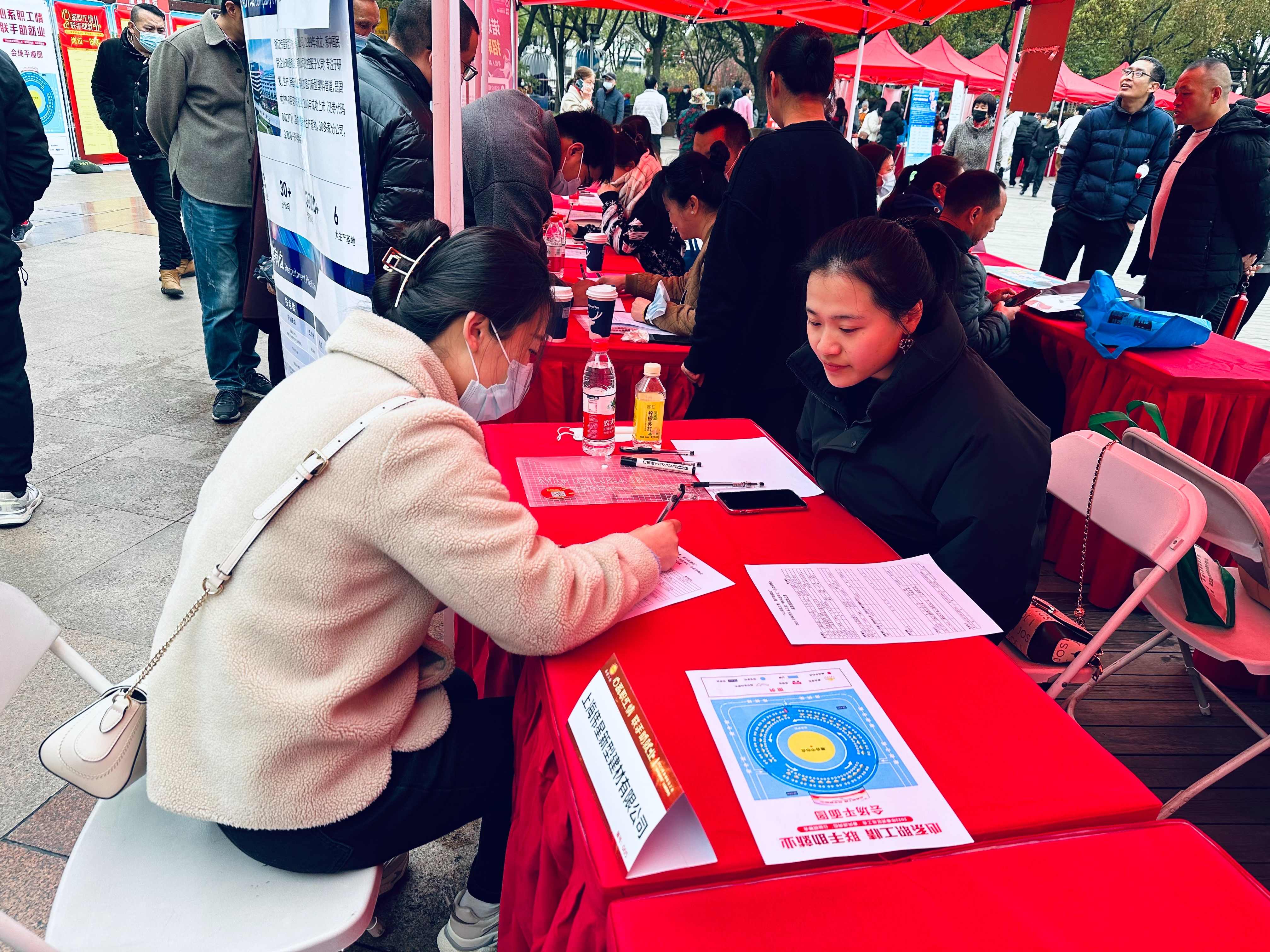 当天下午1点不到,奉贤区文化广场人头攒动,百余个企业摊位呈环形逐次展开,众多求职者前来咨询意向岗位的详细信息,踊跃登记应聘。