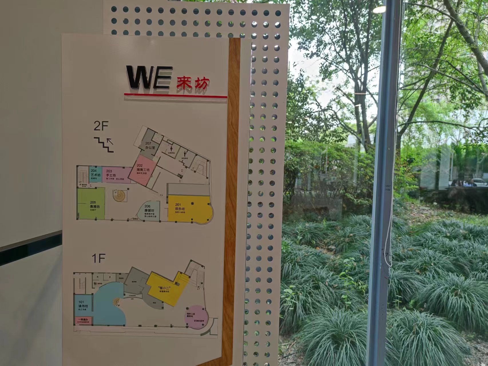 “WE来坊”坐落于潍坊新村街道的核心区域,周边既有国际化的社区和高档商务楼宇,也有滨江沿岸的地标性景点,同时也与普通居住小区毗邻。空间将企事业单位职工、社区居民等人群作为服务对象,做到了全龄友好。在总面积达到1000平方米的两层空间里,设立了满足不同类型党员个性化学习教育需求的“组织活动室”、服务职工精神文化生活的“读书坊”、举办辖区企业家座谈沙龙的“集雅坊”、正在展示海派传统文化的“艺术坊”、社区团建培训集结地的“欢乐坊”、楼宇社区手作交友的“手作坊”、助力职工日常身心健康的“康健坊”、以及“饭小二”联盟和“浦城路街事会”等10余个主要功能区域。