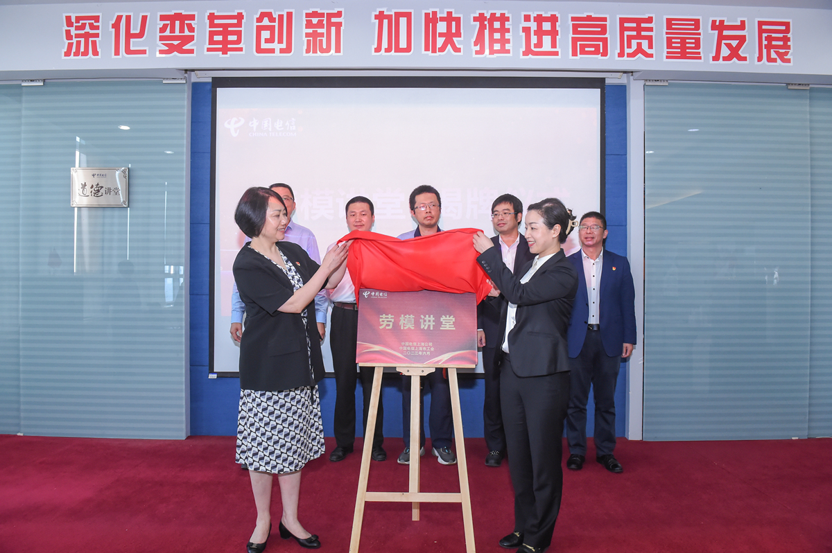 上海电信工会副主席金小铭(左)与邱莉娜为“劳模讲堂”揭牌