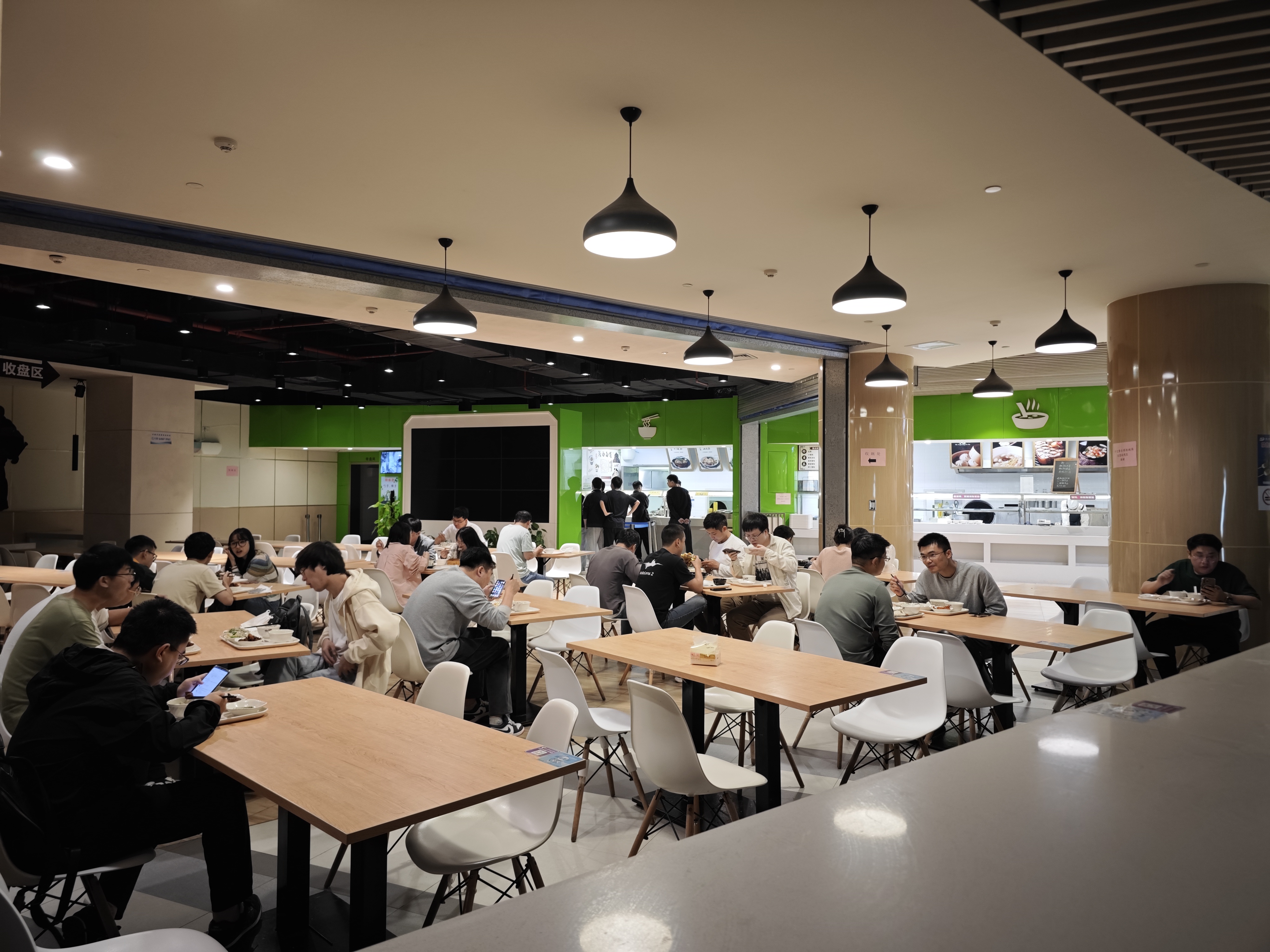 晚上6点,已经是不少企业下班的时候,位于闵行区紫竹高新区的紫叶广场三餐厅里,陆续有职工前来就餐。每晚5点至7点,是紫竹高新区信息数码港有限公司配套服务部运营经理王彬忙碌的时候,餐厅每晚要为约200名职工提供饭菜、面食等晚餐。记者看到,偌大的餐厅里大约有40人正在就餐,多为结伴而来,部分职工背着背包,显然已经下班。王彬告诉记者,园区职工潮汐式特点明显,晚上下班后职工大多会回家吃饭,留在园区的人并不多,“而中午我们要开放两个餐厅,为1700人提供服务。”王彬坦言,6点半之后只有零星的职工前来就餐,因此餐厅会在7点结束营业。“大多数人还是选择回家吃饭,再晚下班的人就会去周边的便利店等解决晚餐。”