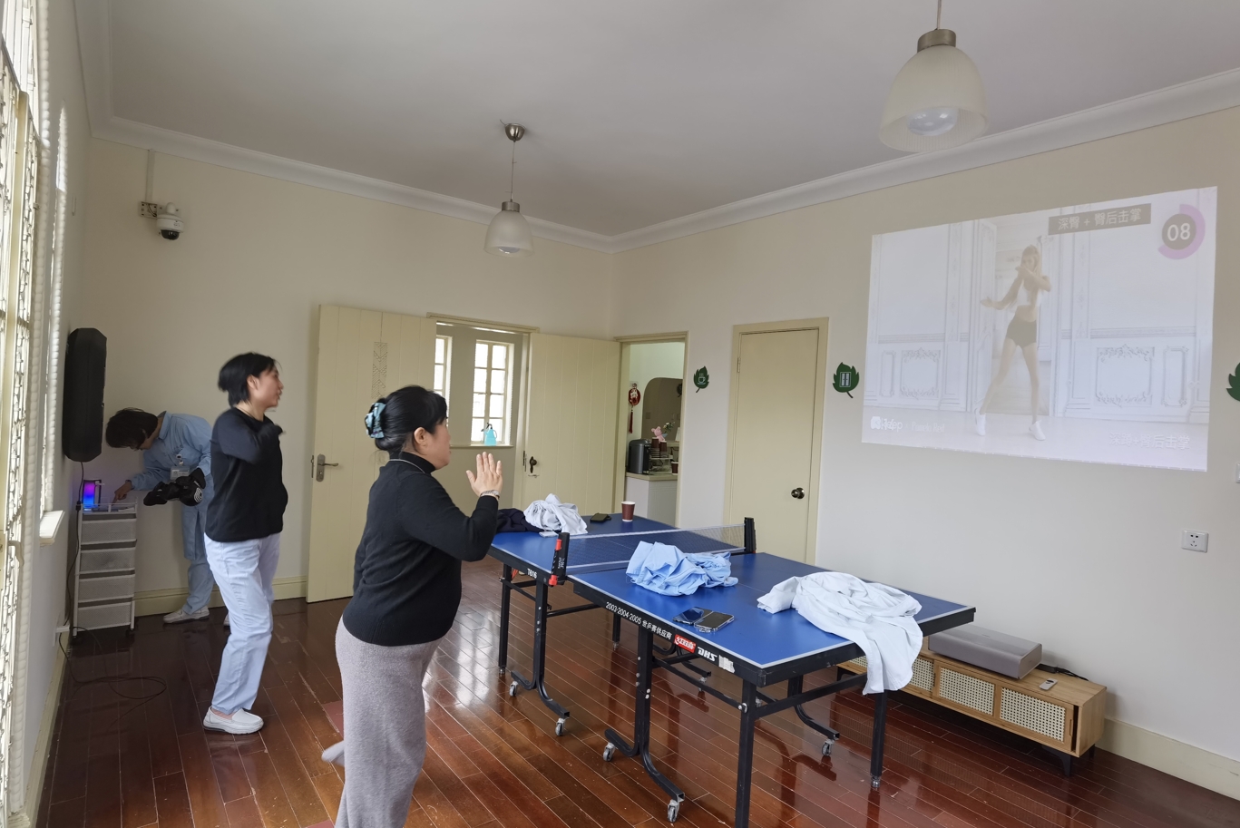 江苏街道社区卫生服务中心职工在工间休息室跳操健身。(受访者供图)
