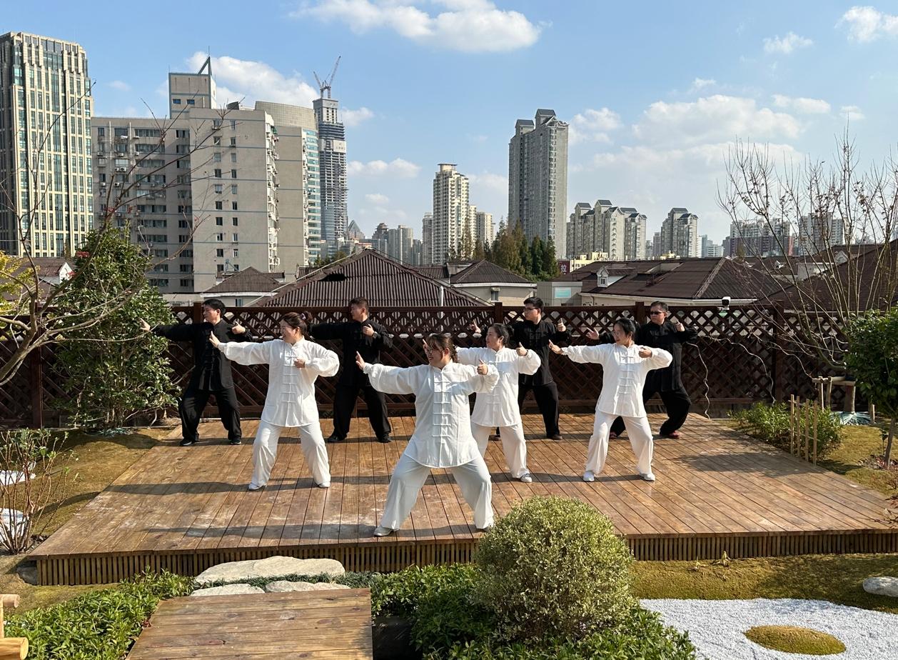 虹桥街道社区卫生服务中心职工在室外工间休息室“屋顶花园”打八段锦。(受访者供图)