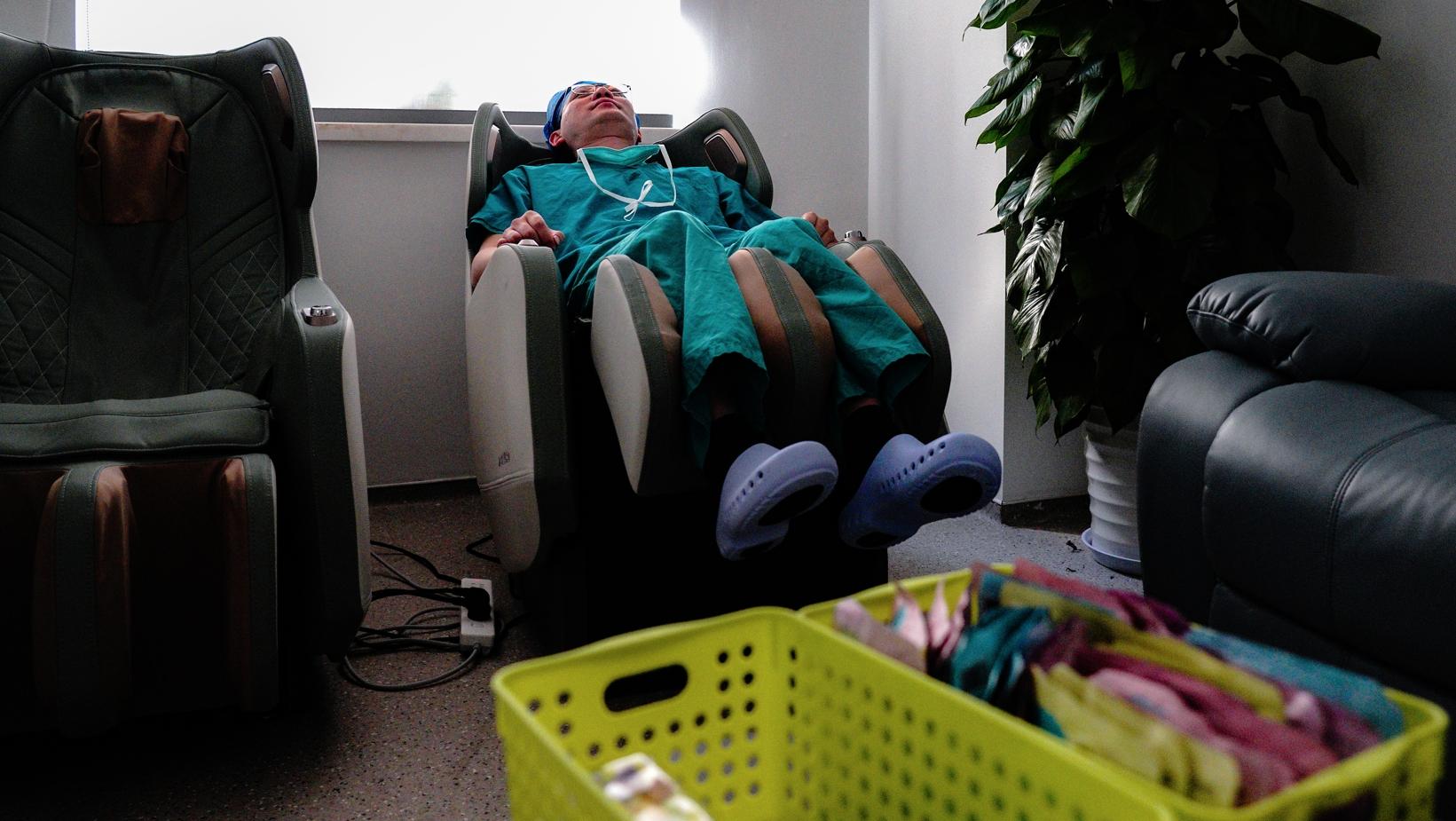 同仁医院医生陈洪飞在手术室工间休息室按摩椅上休息,医院工会还在休息室准备了耳塞、眼罩等物品供职工使用。