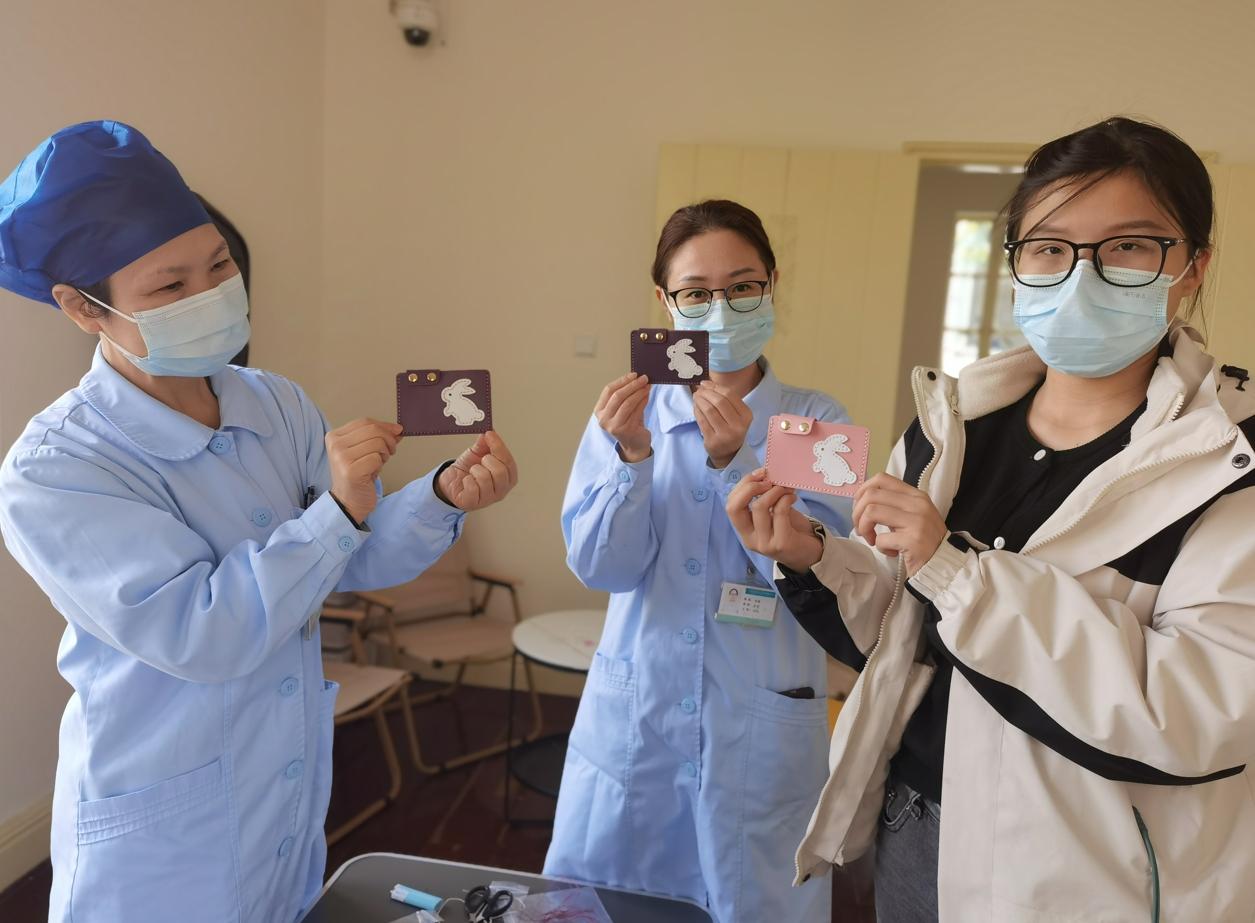 江苏街道社区卫生服务中心职工在工间休息室制作手工皮具。(受访者供图)