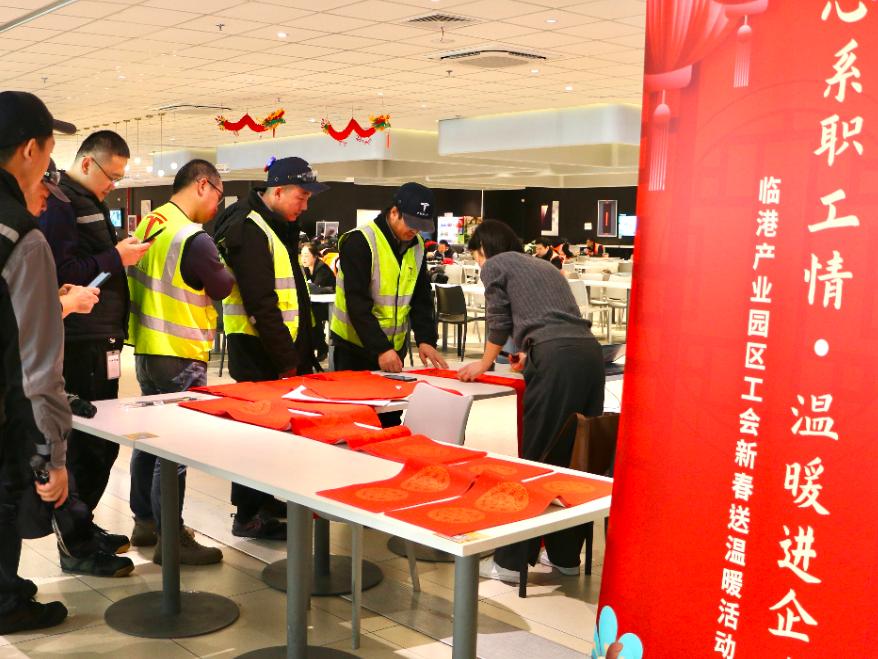 近日,临港产业园区工会相继走进苏大丰产业联动集聚区开发建设有限公司、特斯拉上海超级工厂、临港奉贤蓝湾园区,开展三天三场的送春联活动。现场,书法家和职工书法爱好者们饱蘸浓墨、提笔挥毫,为大家送上龙年新春的美好祝福,一副副寓意吉祥的春联跃然纸上,职工们流连在作品前,或驻足品读,或成群交流,或拍照发圈分享自己喜爱的作品。“过年贴春联,是中国春节最具仪式感的环节,能够领到书法家的手写春联,年味更浓了!”现场职工领到心仪的春联后不禁喜上眉梢。