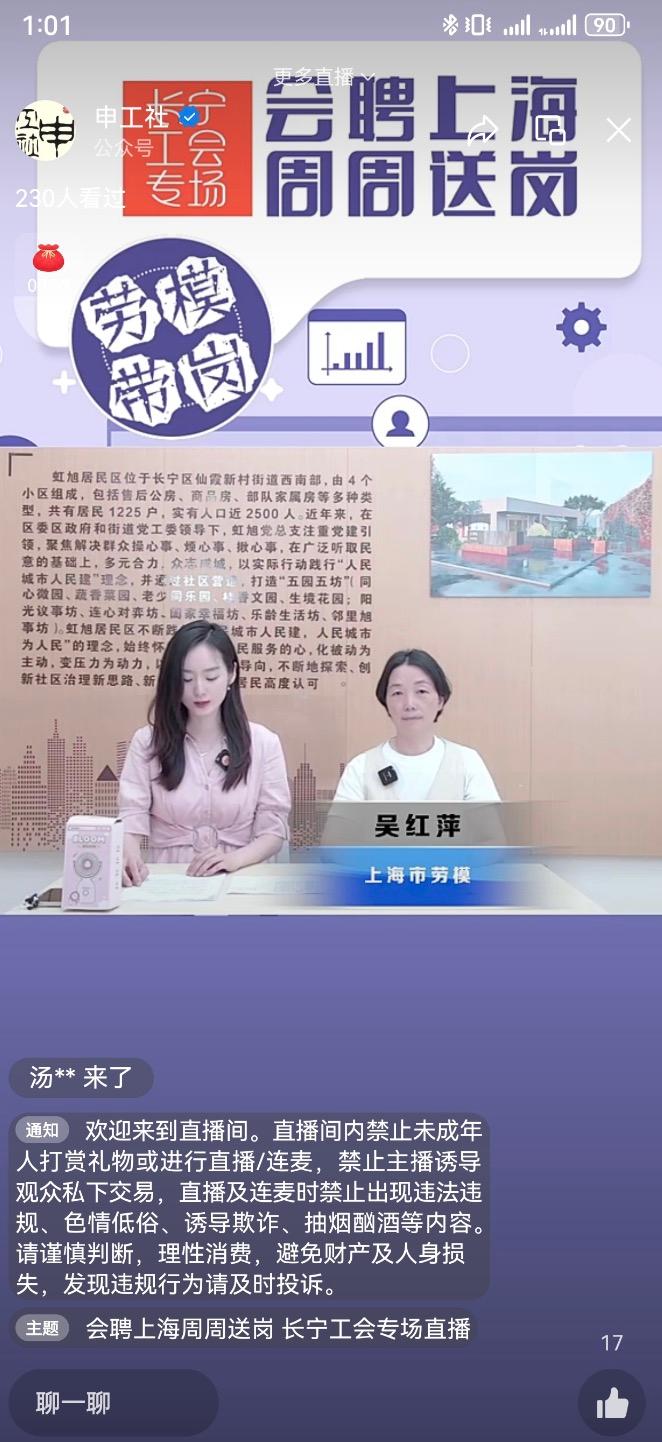 当天招聘会线上同样火热。下午1时,上海市劳模、长宁区仙霞新村街道虹旭居民区党总支书记吴红萍准时做客“申工社”视频号,线上为求职者带岗,以帮助辖区内未就业应届高校毕业生与失业人员就业。直播期间,吴红萍还结合自己多年的社区工作经历,向正在找工作以及刚刚入职的朋友分享了自己在职业选择和职业生涯规划方面的经验。