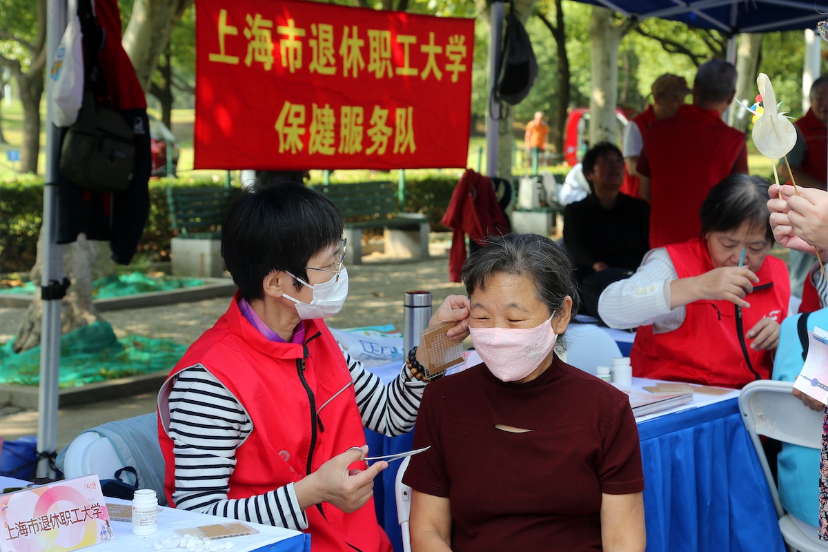 上海市退休职工大学保健服务队志愿者在为老年人按摩耳穴。