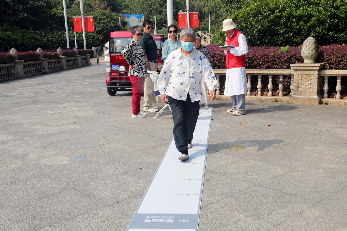 老年肌少症筛查是今年新增的服务项目,一位老人正在进行筛查项目之一—6米步速检测。