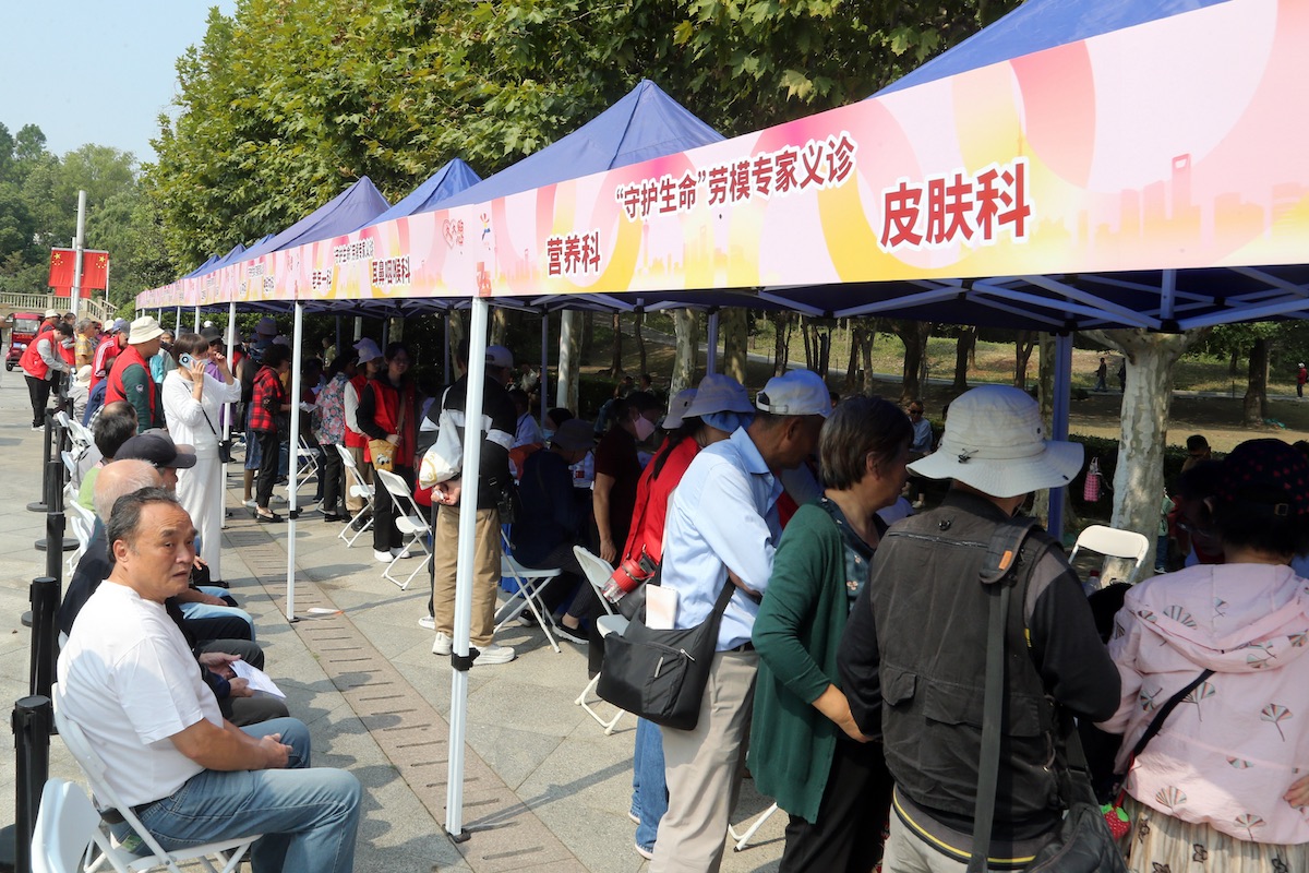 市医务工会组织的“守护生命”劳模专家义诊深受老年人喜爱,在各科摊位前大家排起长队。
