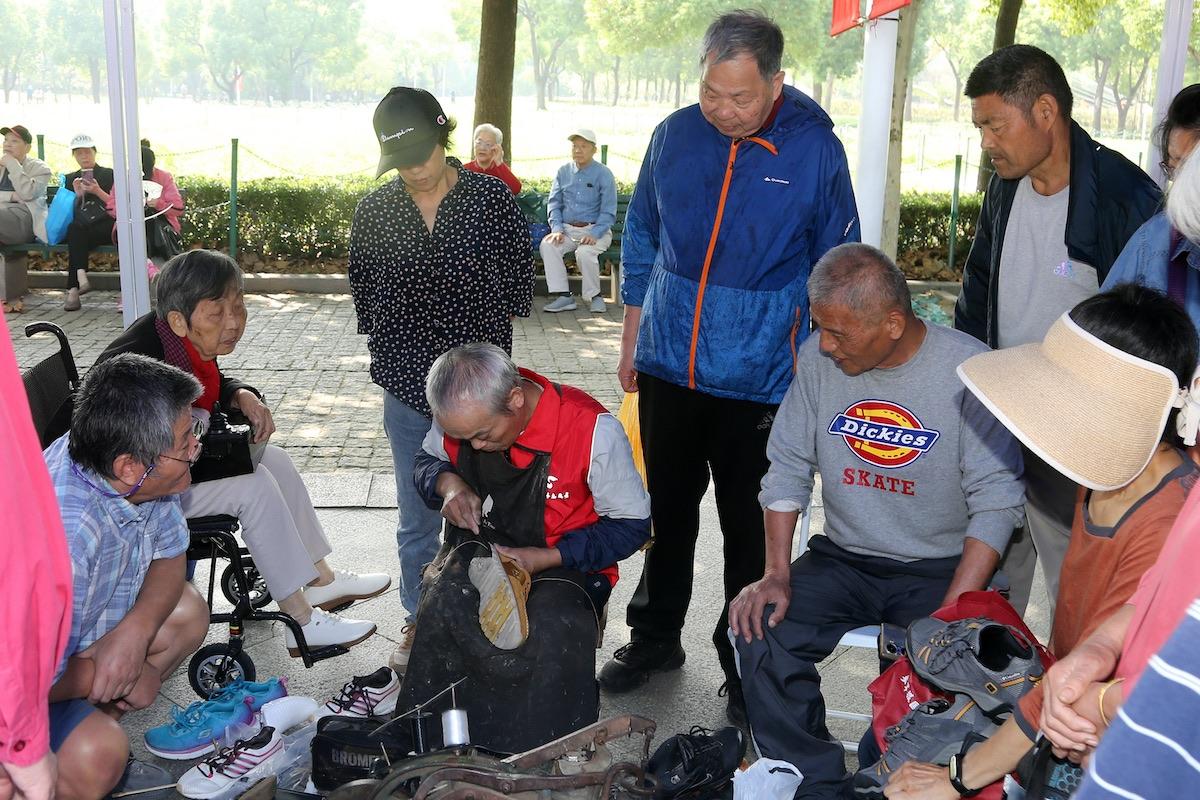 老人们有“备”而来,带着需要修补的鞋子在志愿者摊位前排起长队。