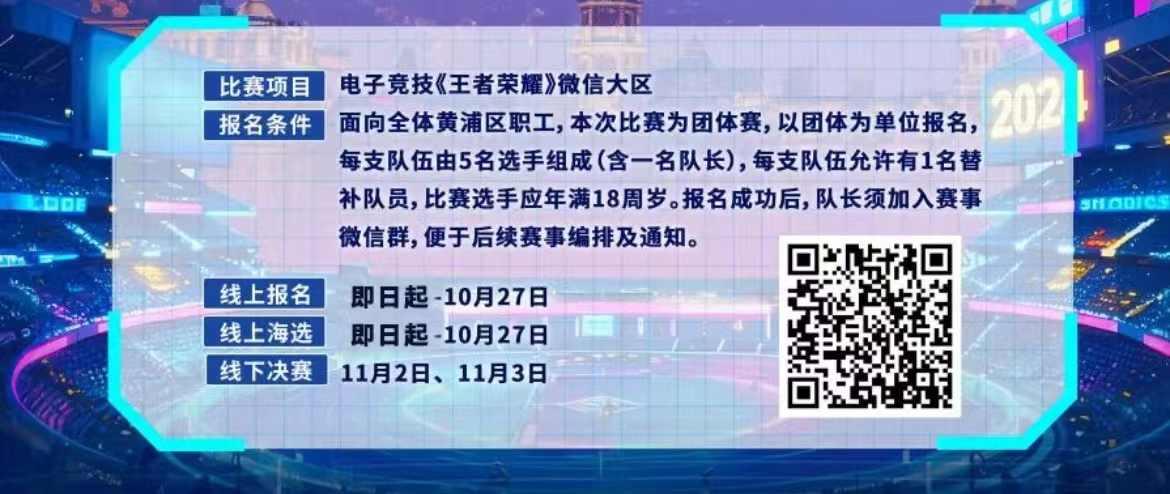 2024“外滩杯”黄浦职工“王者荣耀”电竞大赛即将拉开战幕。本次大赛由上海市黄浦区总工会、上海市黄浦区外滩街道总工会、上海外滩投资开发(集团)有限公司、五星体育传媒有限公司主办,上海五星网络科技有限公司承办。目前面向黄浦区职工进行招募,即日起至10月27日,黄浦区职工可扫描海报二维码进行报名。