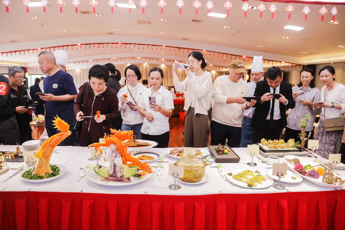 比赛现场的试吃环节将气氛推向最高潮。参赛作品一道道呈上,观众和评审们在品尝菜肴的同时,热烈讨论着各道菜的口感与创意。评委们从“色、香、味、形、器”五大标准,对每一道菜品进行专业评判。上海工匠、上海糖师师培训学校有限公司技术总监郁慧,对上海易宴餐饮管理有限公司的“祥龙献瑞——意境冷拼”作品赞许有加。“这道雕刻龙不仅造型栩栩如生,龙身的每一处细节处理得极为精致。”她感叹,“这类雕刻技艺在许多餐饮学校已逐渐消失,能在技能大赛中看到如此精湛的作品,实属难得。”而锦巷私房菜带来的甜点“柿柿如意”也赢得了评委的一致好评,“不仅在口感上清甜爽口,更在视觉上给人耳目一新的感觉,巧妙地将传统寓意和现代餐饮结合得恰到好处。”市劳动模范、上海市中西餐厅服务裁判王妙琴说道。