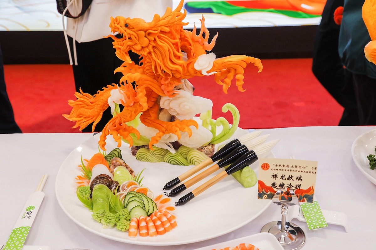 由上海易宴餐饮管理有限公司带来的主题菜“祥龙献瑞——意境冷拼”极具立体美感,雕刻龙栩栩如生。