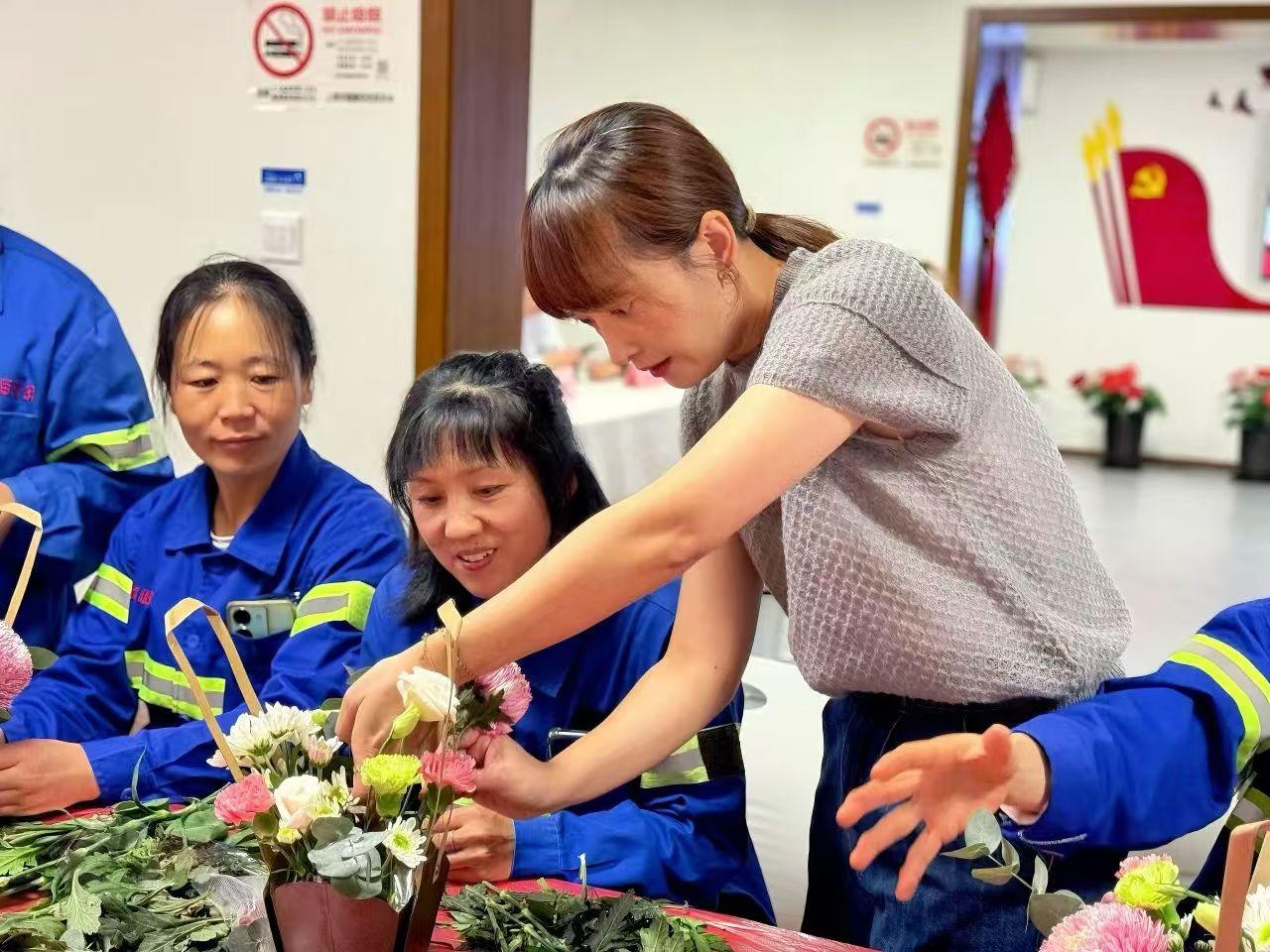 当天的活动现场热闹而温馨。测量血压、中医咨询等服务,让环卫工人们在繁忙之余能够关注健康。同时,依托区总工会“公益乐学”项目资源,特别安排了一堂艺术插花课程。专业园艺老师将插花的美学与技巧娓娓道来,从花材挑选、修剪,到设计造型一一展示。在老师的指导下,环卫工人们全神贯注地创作自己的作品。不少环卫工人表示,花艺课不仅让他们难得地放松了下来,也在亲手创作中体会到了美的乐趣。