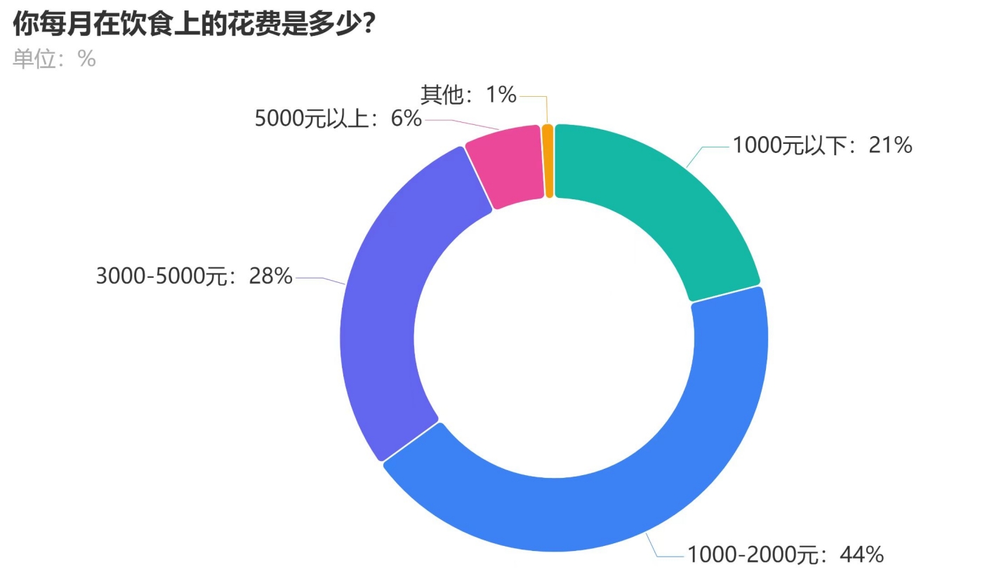数据显示,在4155位参与本次调查的受访者中,65%的受访者每月在就餐方面的花费在2000元以内;28%的受访者每月的就餐花费在3000~5000元区间。