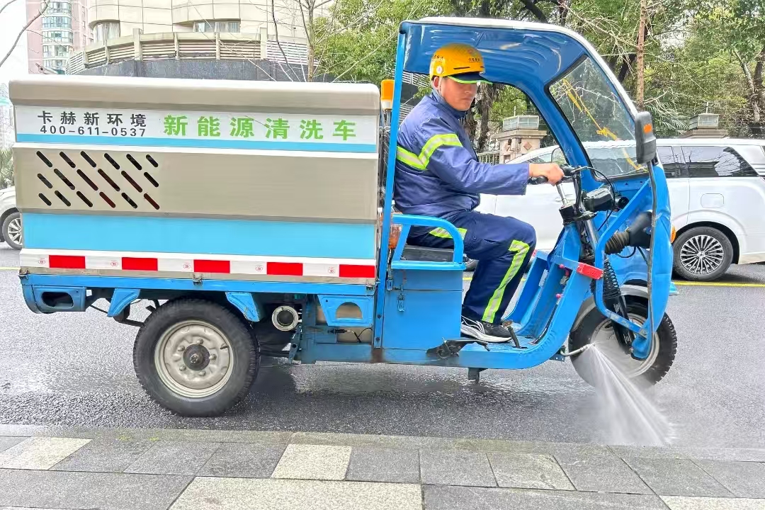此前,针对市民反映的三轮冲洗车水雾溅射问题,东虹公司的环卫工人们集思广益,进行了三轮技术改进。最终通过改动冲洗机水泵分压装置和高压管方向,将斜冲改为排冲,在保证作业质量的同时,最大程度减少对市民的影响。