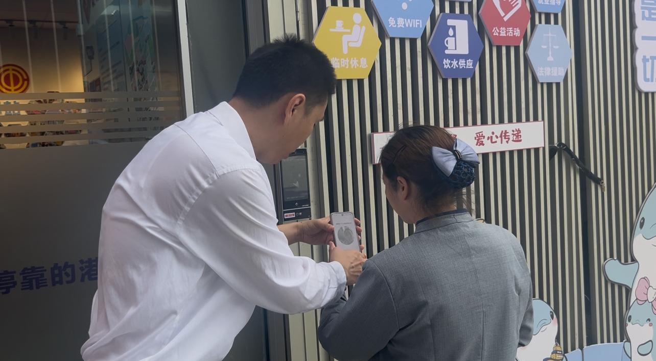 “海上世界”工会驿站采用24小时无人值守模式,街道工会干部正教一已加入工会的商圈保洁员如何用随申码开门。