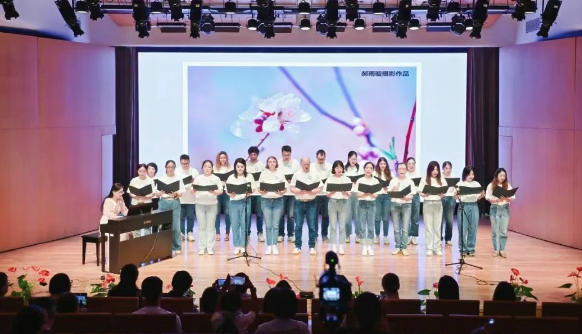 演出现场,14个精心编排的节目轮番登场,古典舞婉约含蓄,牛仔舞动感欢快,蒙古舞豪迈奔放,国标舞优雅华丽,京剧《霸王别姬》尽显国粹精髓,红色经典歌曲《洪湖水浪打浪》《再看一眼亲人》赓续红色血脉,法语班教师携手巴黎卓越工程师学院同仁演绎的《放牛班的春天》主题曲,唤起了大家心灵的共鸣。值得一提的是,工会摄影班学员的精选作品也作为诗意背景融入歌唱类节目,体现了不同艺术门类间的巧妙联动。整场演出主题鲜明,气势恢宏,充分展现了培训课程的多样性和教职工们的别样风采。