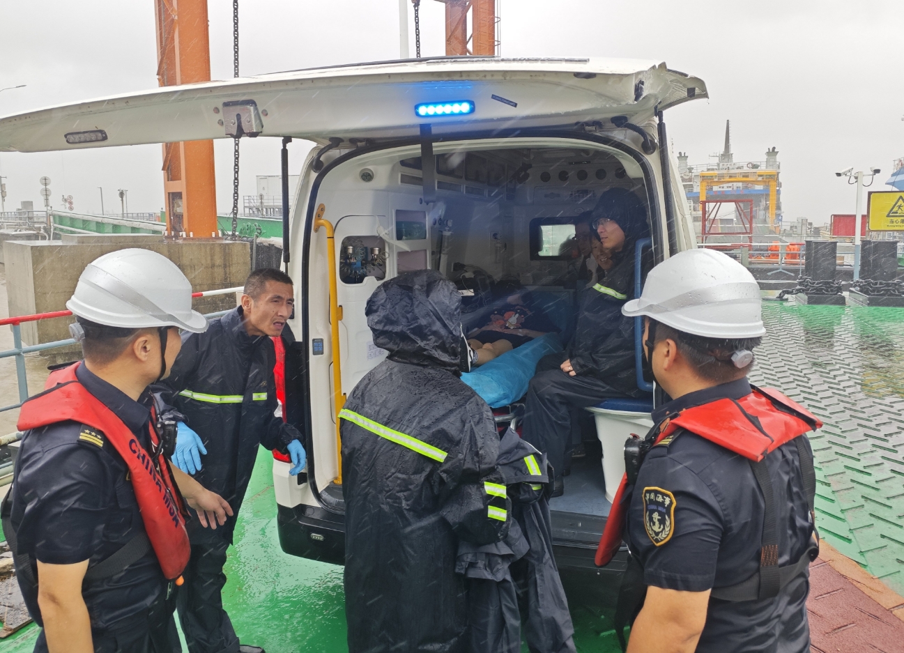 横沙海巡执法大队科学评估气象海况情况和救助需求,现场指挥果断制定救援方案,“我们精准研判航道状况,协调辖区内一艘抗风等级高、运行平稳的‘宝海交测6’轮作为应急转运轮艇赶赴现场。”横沙海巡执法大队表示,海事执法人员与码头方做好沟通,选择最有利于伤员安全登离轮的泊位,同时登上应急船舶全程指挥,转运时,执法人员用身体为伤员挡住风雨。