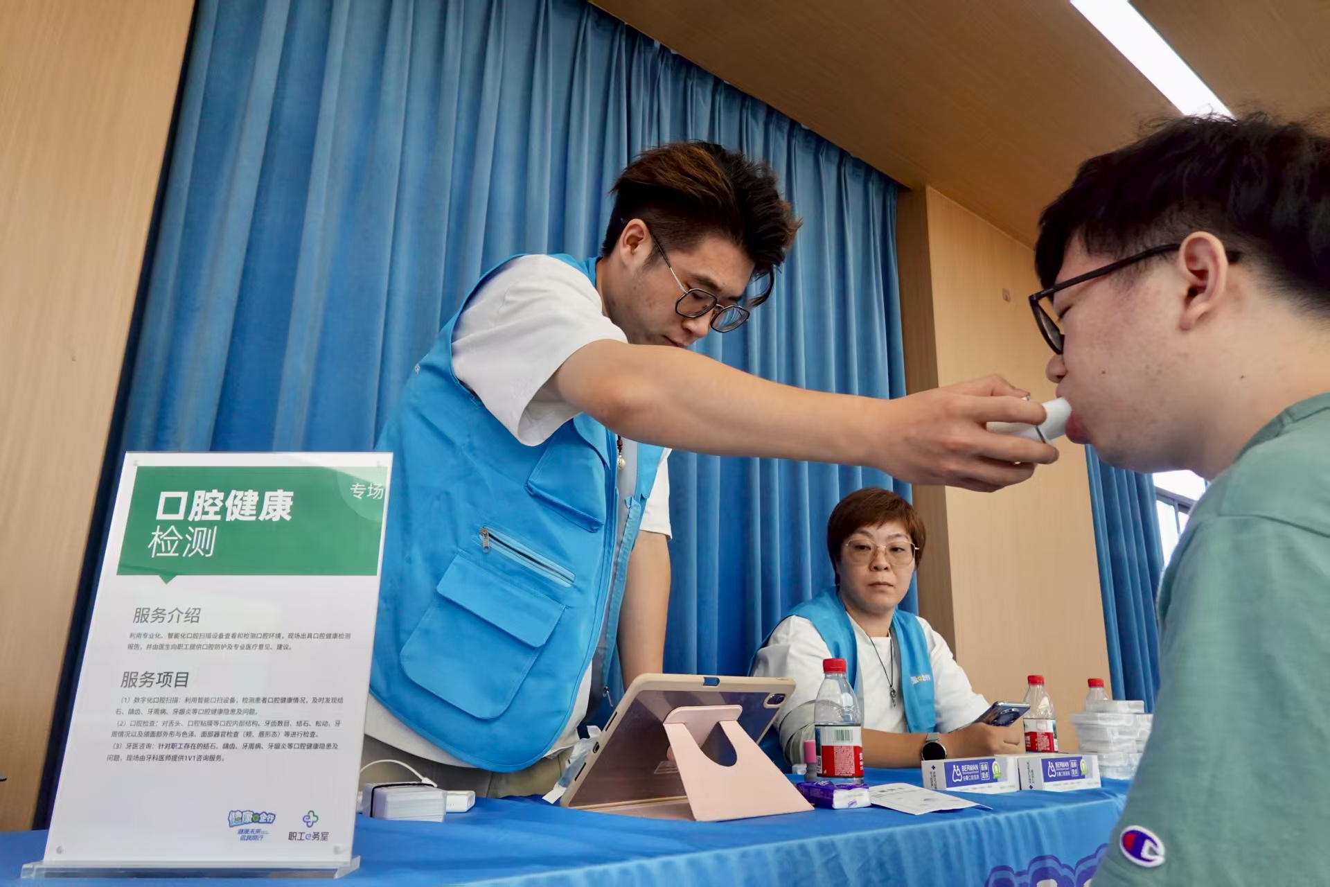 中医问诊区人气十足,老中医们通过“望闻问切”为职工们把脉问诊,耐心解答他们的健康疑问,从日常作息到饮食调理,逐一提供针对性的调理建议。三伏贴和耳穴压豆体验区也吸引了不少职工参与,他们希望通过传统的中医疗法来增强体质,预防疾病。中医体质辨识镜检测区,通过分析用户的面部、舌象等生物特征,结合问诊信息,快速准确地进行中医体质辨识,帮助他们更好地了解自己的身体状况,制定个性化的养生计划。