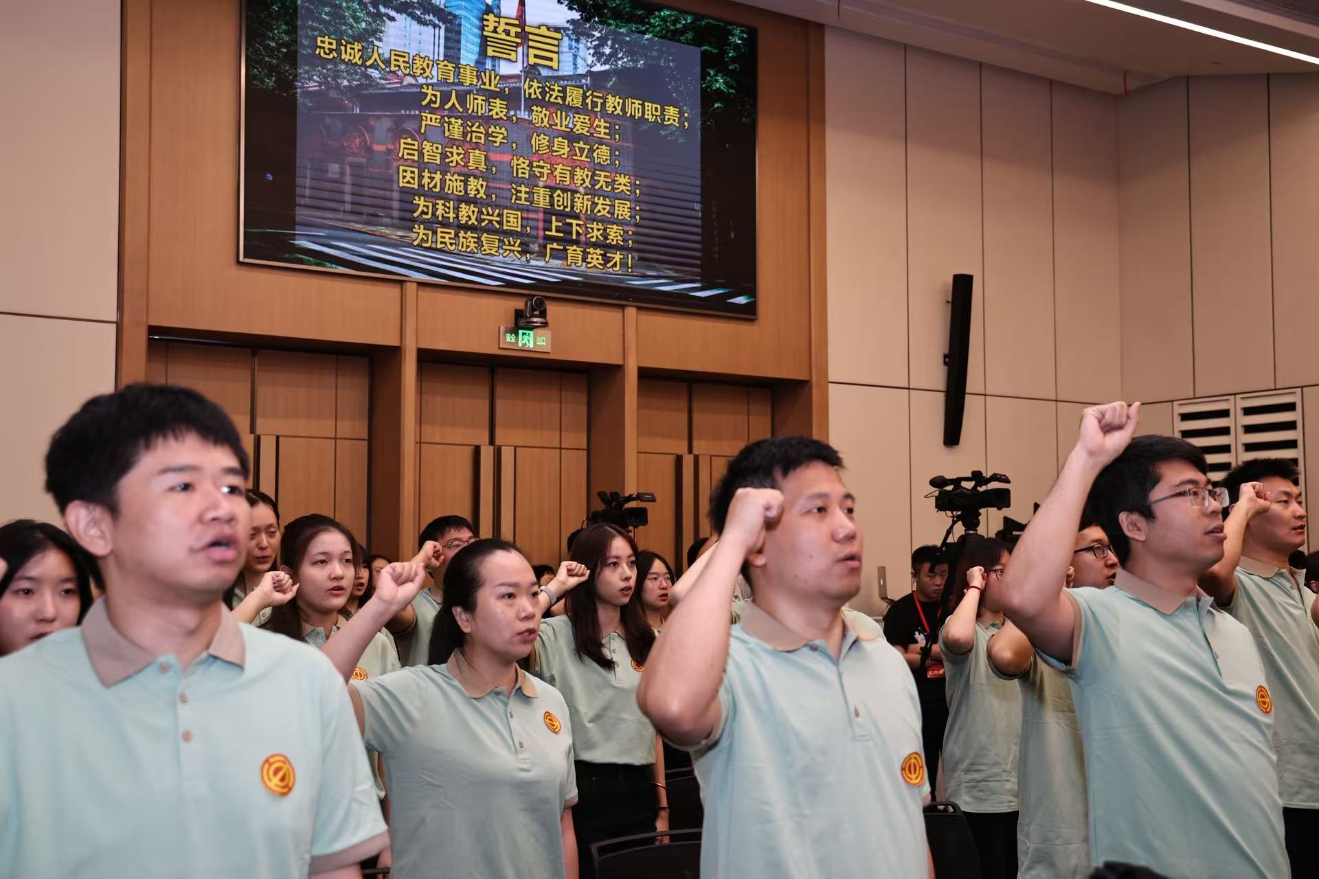 “忠诚人民教育事业,依法履行教师职责……为民族复兴,广育英才。”初心始发地,一张张青春的面孔,眼神坚毅,誓言铿锵。9月10日上午,2025年上海市新教师入师入会仪式暨第二届“申教名匠”颁奖仪式在中共一大纪念馆报告厅举行。在上海师范大学原校长、教授杨德广的领誓下,50名新教师代表紧握右拳、庄严宣誓。