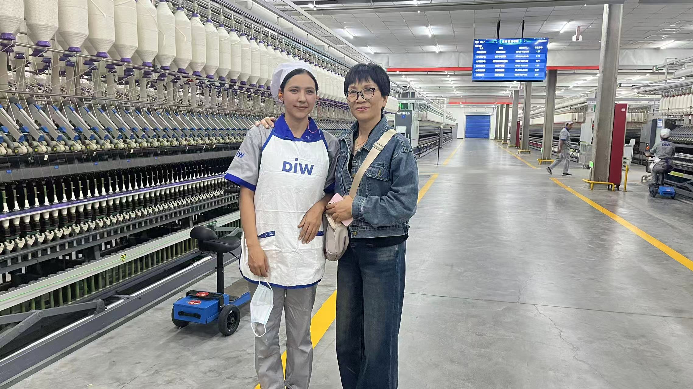 陆美华在细纱工序前和挡车工约尔扎迪·马木提聊了起来,约尔扎迪主动给陆美华展示了她的挡车工序,看着她熟练、快速的操作手势,这位上海老纺织人很惊讶。当得知工人们在这里从培训到工作的时间都不长,陆不禁竖起大拇指,“我看她的操作,不论是牵伸还是卷绕,我觉得都是顶尖的水平,在我们那个时候绝对算得上是技术能手。”