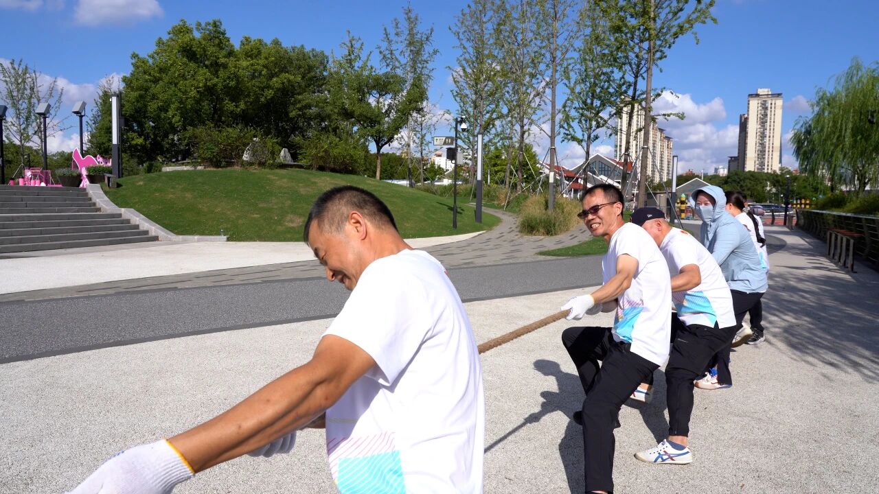 拔河场上,红绸在两队之间来回拉锯,每一次发力都伴随着整齐的呐喊声,大家拧成一股绳,才能真正体会到“团结就是力量”的含义。“旱地冰壶”“无敌风火轮”“十指同心”,每一项都是对团队默契与协作能力的挑战。徒步团队赛沿着半马苏河步道出发,考验耐力的同时欣赏苏州河畔的美景。大家在路途上看到了半马苏河的变化,对于普陀区的发展感到由衷的骄傲。