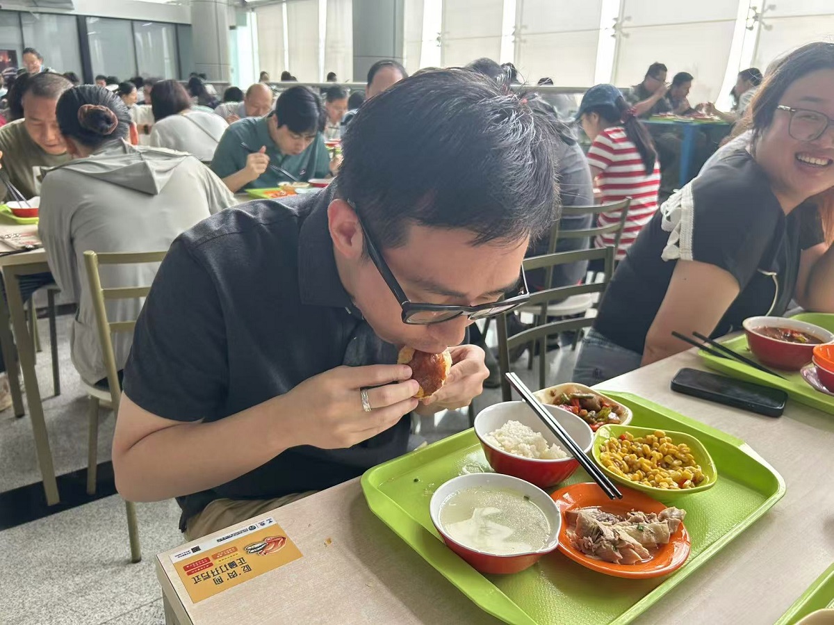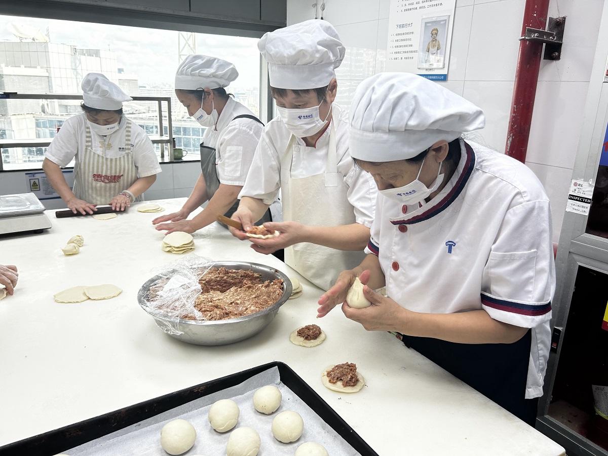 从8月底开始,上海电信9家员工食堂共同启动“月饼工程”。每天清晨5点,制作月饼的师傅们便早早到岗开工:洗肉、挑筋、剁馅、调味、和面、擀皮、包馅、烘烤……几乎每一道工序都靠手工完成。到了中午用餐时段,信息大楼、川北大楼、武胜大楼等食堂里,点心窗口前的队伍排得满满当当,千余份热气腾腾的月饼往往在半小时内就全部售罄。