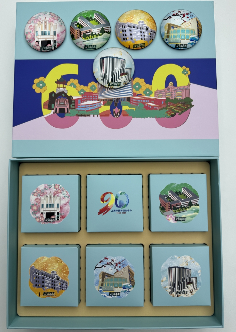 早在2021年,上海市精神卫生中心推出的月饼火了,一度登上热搜,一饼难求。今年,曾刷屏网络的网红月饼上新,“600号月饼”迎来五周岁,月饼礼盒犹如一幅可触摸的时间画卷——五座承载医院历史与创新的标志建筑融于春夏秋冬四季意境中。普慈疗养院大门、住院部老楼、心理咨询与治疗中心、徐汇院区门诊大楼、重性精神疾病诊疗中心的图案分别化作礼盒封面上一轮明月的形状,以随机盲盒的方式包装。各个职工所购买的每盒月饼,封面上大楼的图案都是不同的。