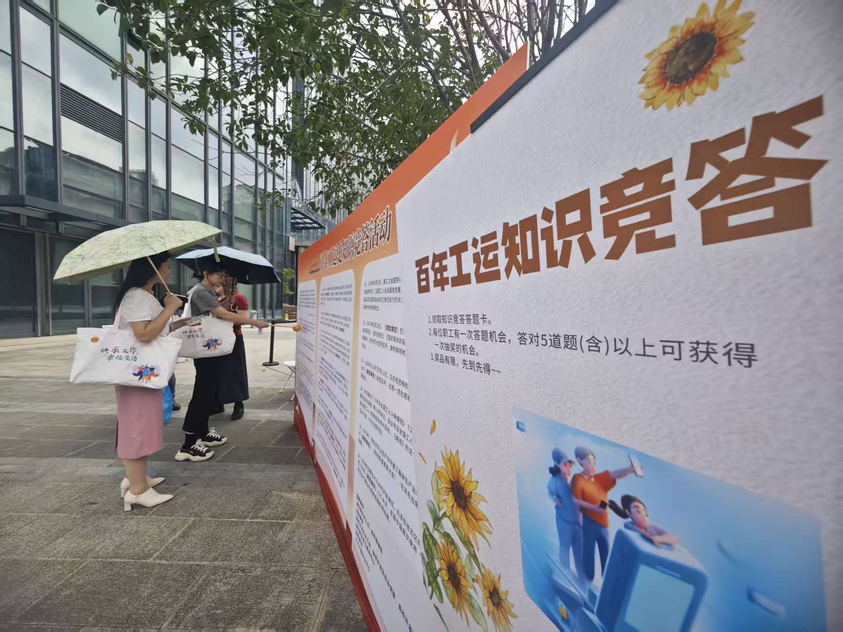 10月15日中午,位于东方万国企业服务中心广场上,一场由工会组织的“幸福金桥”员工心理关爱嘉年华暨职工品质生活节正在热闹开展,过路的职工们徘徊各类摊位前,参加“百年工运知识竞答”、“幸福心理嘉年华”、党群志愿服务、爱心义卖、品质商品惠购等服务。与此同时,在不远处的金桥能量屋户外职工驿站正式揭牌启用,来自金桥社区卫生服务中心的医生正在教网约车司机们体验“腰颈椎保健简易操”并提供义诊服务,当天,一批由浦发公益基金会捐赠的物资也同步配送到驿站中。在位于上海山南勘测设计有限公司的工间休息室里,一场温馨的山南职工读书分享会为职工开启一场心灵之旅。