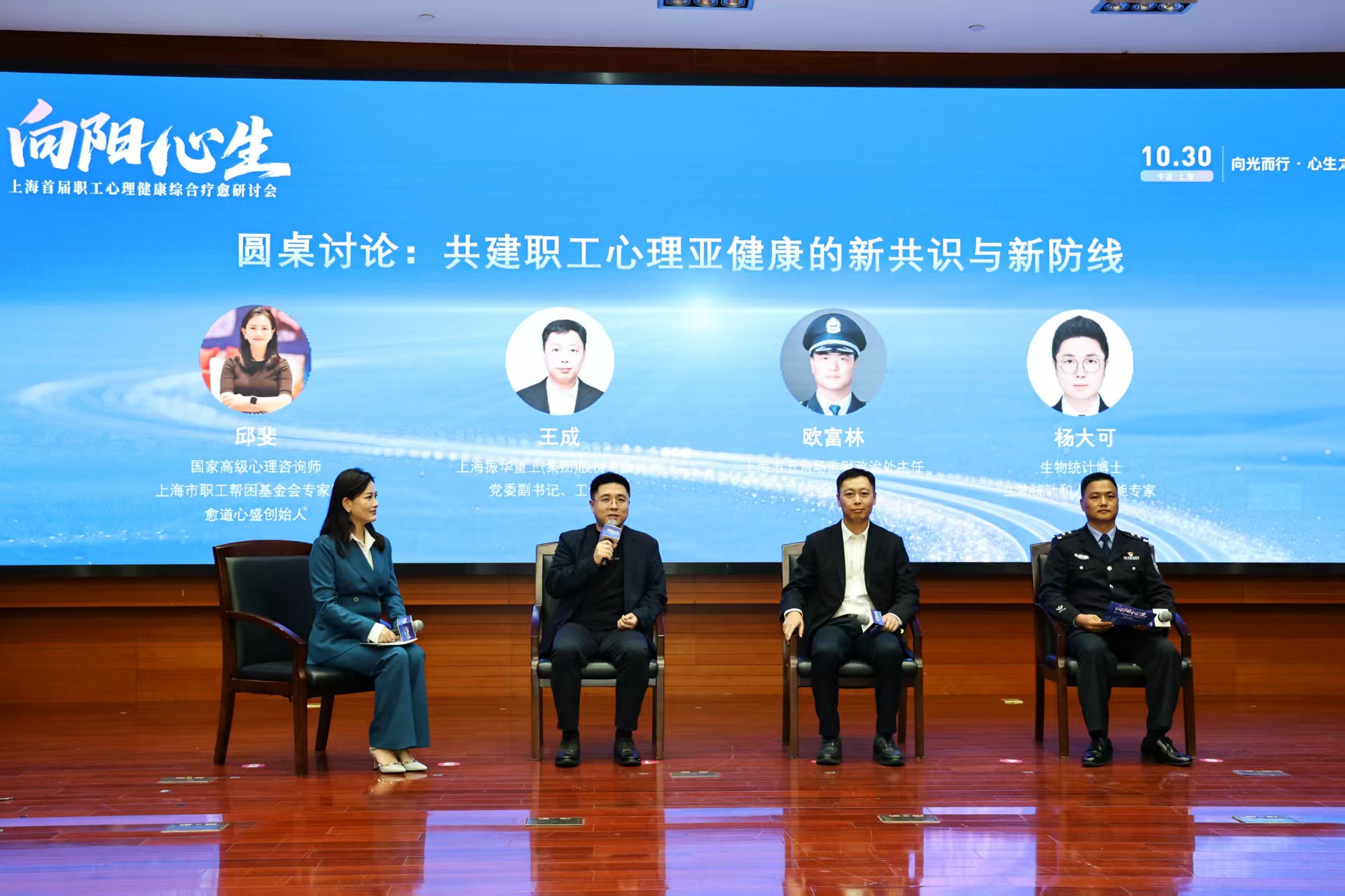 圆桌对话环节,由市总工会职工帮困基金会专家顾问、愈道心盛创始人邱斐主持,特邀生物统计专家杨大可、振华重工集团工会主席王成、五角场监狱工会主席欧富林三位嘉宾,围绕“共建职工心理亚健康的新共识与新防线”展开深度探讨,为完善职工心理健康服务体系提供多元视角。