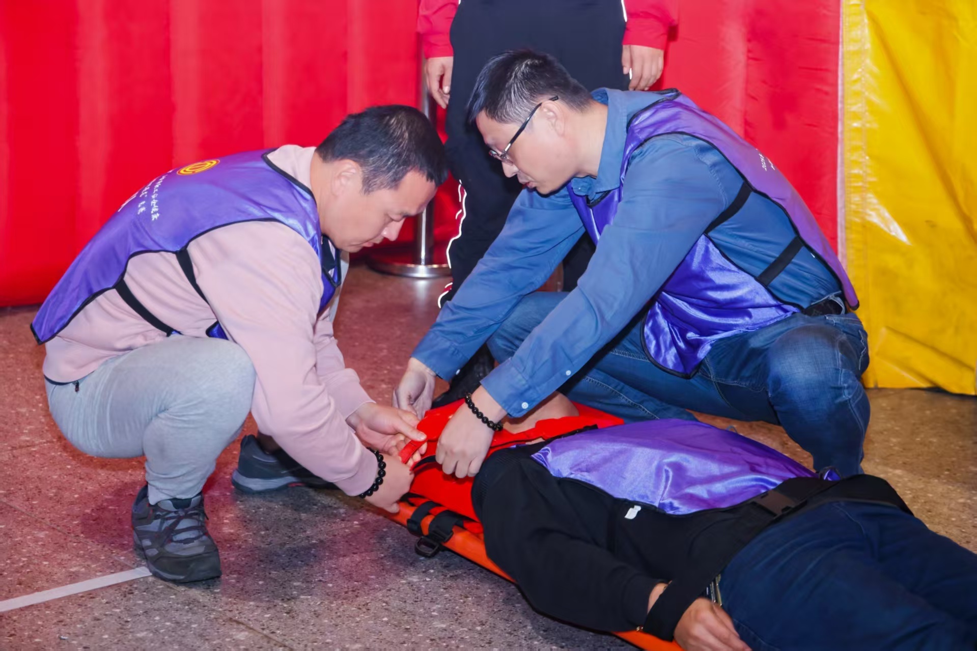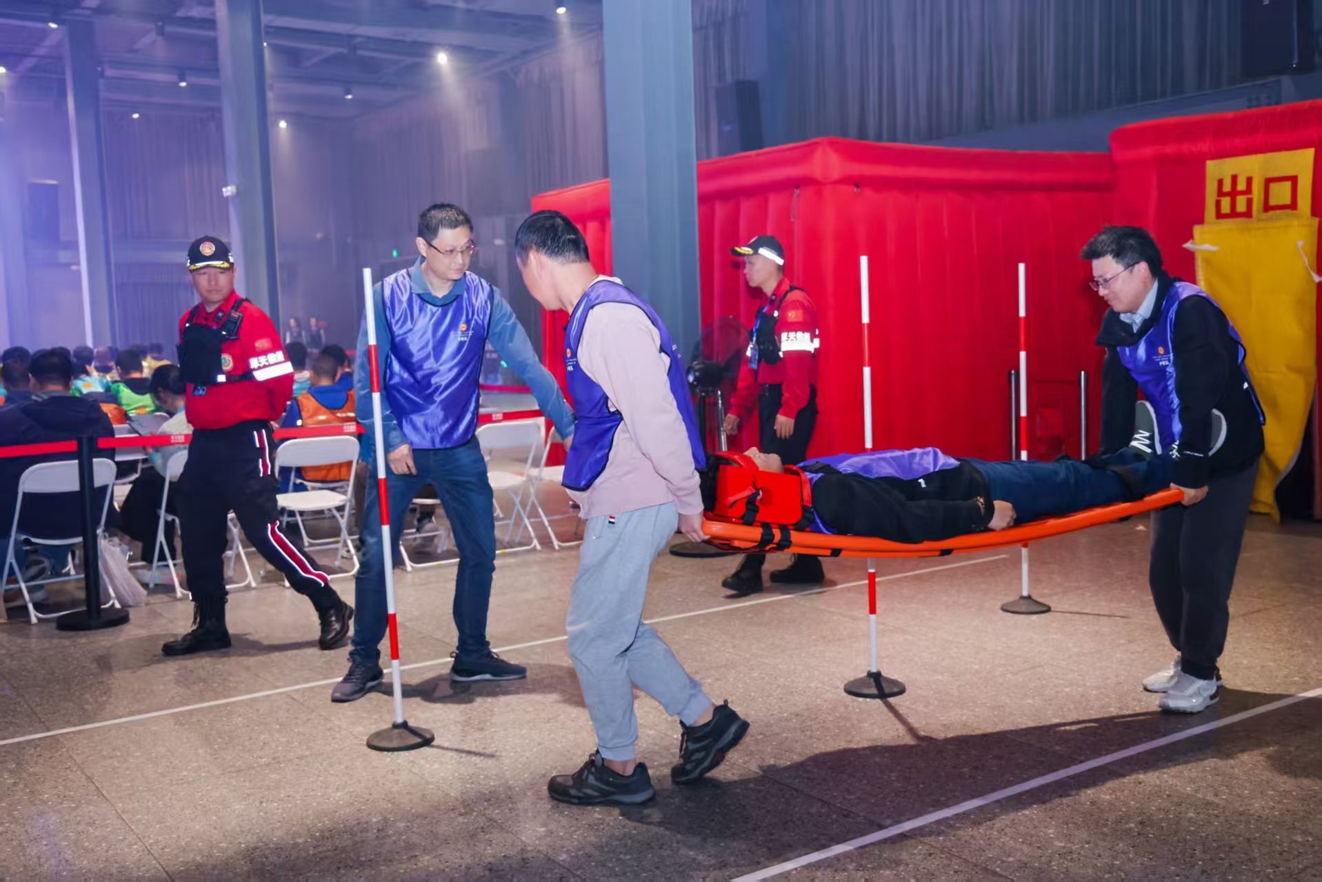 各赛场亮点纷呈,全方位考验选手的安全素养与实战能力。安全知识答题赛场节奏紧凑,100道题目涵盖安全法规、仓储规范等核心内容,既比拼知识储备,又考验答题速度与准确率。AR场景找隐患赛场科技感十足,选手需要在5分钟内,从专家设置的6个模拟仓储场景中精准排查出安全隐患。应急救援实操赛场则凸显团队协作,参赛队伍需连续攻克灭火器正确选择、模拟室内火灾逃生、担架绕桩转运、心肺复苏四大科目。
