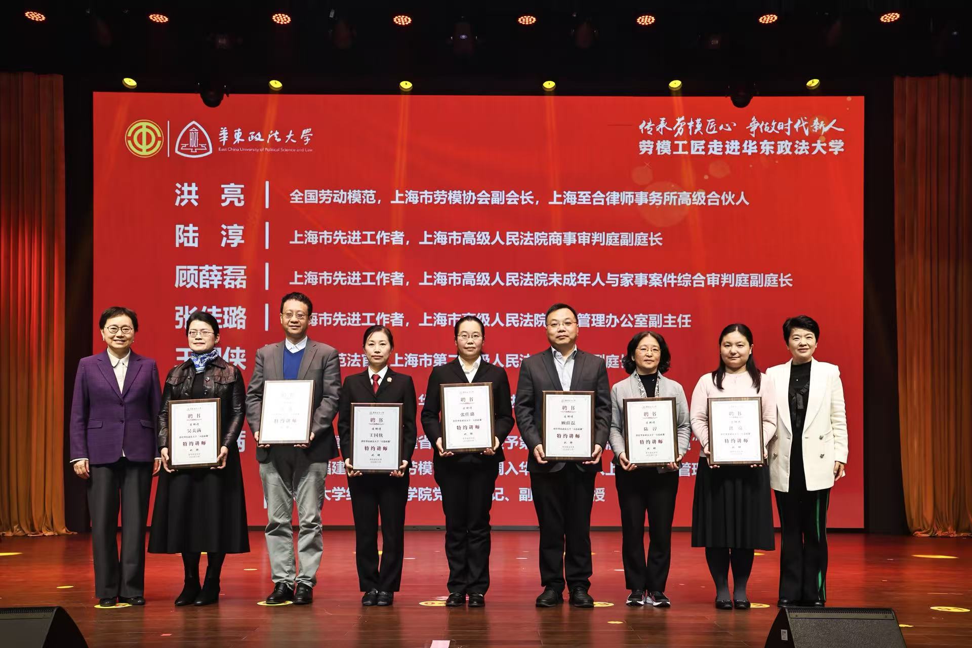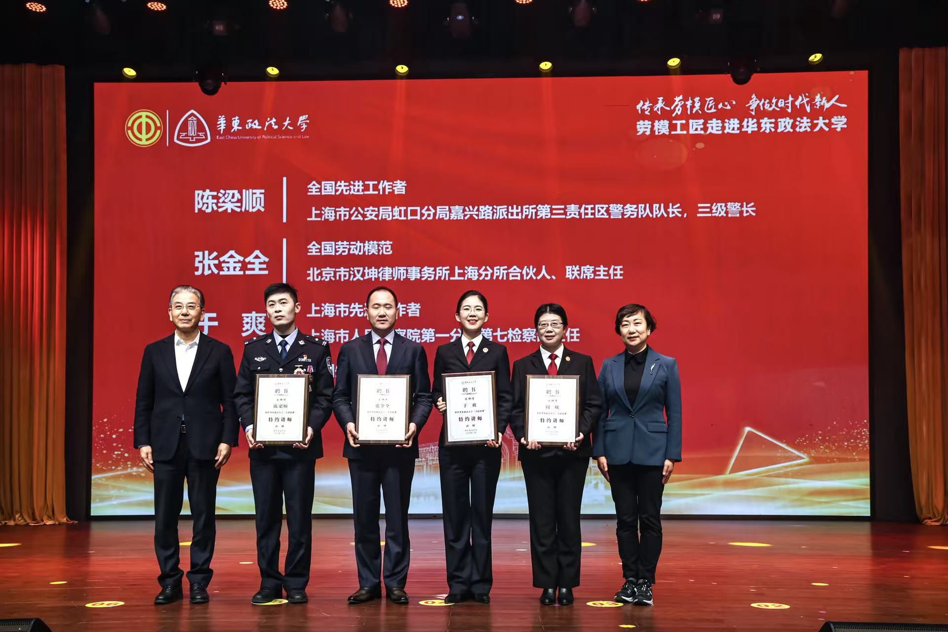 今年是华东政法大学建校73周年。73年来,学校以“立德树人、德法兼修”为根本,培养了一代又一代投身法治事业的华政人。学校常态化开展“劳模工匠进校园”品牌活动,让劳模精神可触可感,推动劳动教育与思政教育深度融合。当天,学校向陈梁顺等11名政法领域劳模先进颁发了“华东政法大学‘大思政课’特约讲师”聘书。