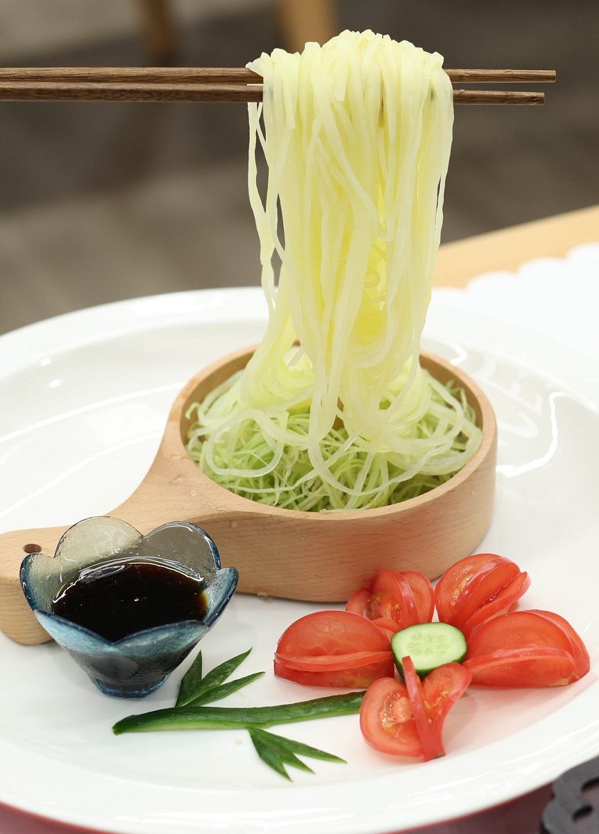 有参赛选手用古法酸菜炝炒,让朴素的土豆带着东北家常的温度;另有厨师以滚刀切法,将土豆削成细如发丝的长线,最长的一道足足拉到了近两米——不仅考验刀工,更考验对食材的理解和创意的表达;还有团队将土豆做成了工艺摆盘,让“寻常小菜”多了美食艺术的气质。