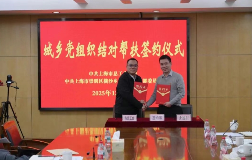 12月22日,上海市总工会党组与崇明区横沙乡永胜村党总支开展城乡党组织结对帮扶签约。市总工会党组成员、副主席赵德关,崇明区副区长金彪,横沙乡党委书记曹俊,乡党委副书记陶政江,副乡长顾伟达等出席。横沙乡党委委员倪金金主持签约仪式。
