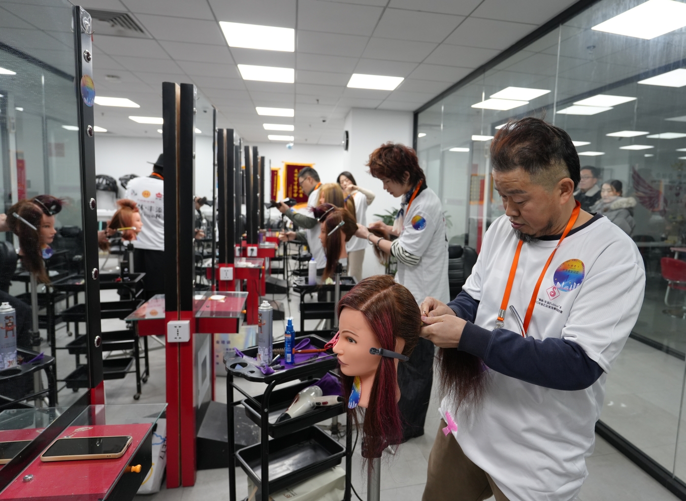 比赛前两天,枫林街道会镅理发店店长杜杰在赛前培训上领到他的赛用“模头”,带回店里钻研了一整天,染发、盘发、包发,一直练习到了深夜。入行13年,这是他首次参加美发比赛,心中既重视又难免紧张:“我最担心的就是实操盘发,我以前没怎么接触过这种标准的,这次真是开了眼界。”