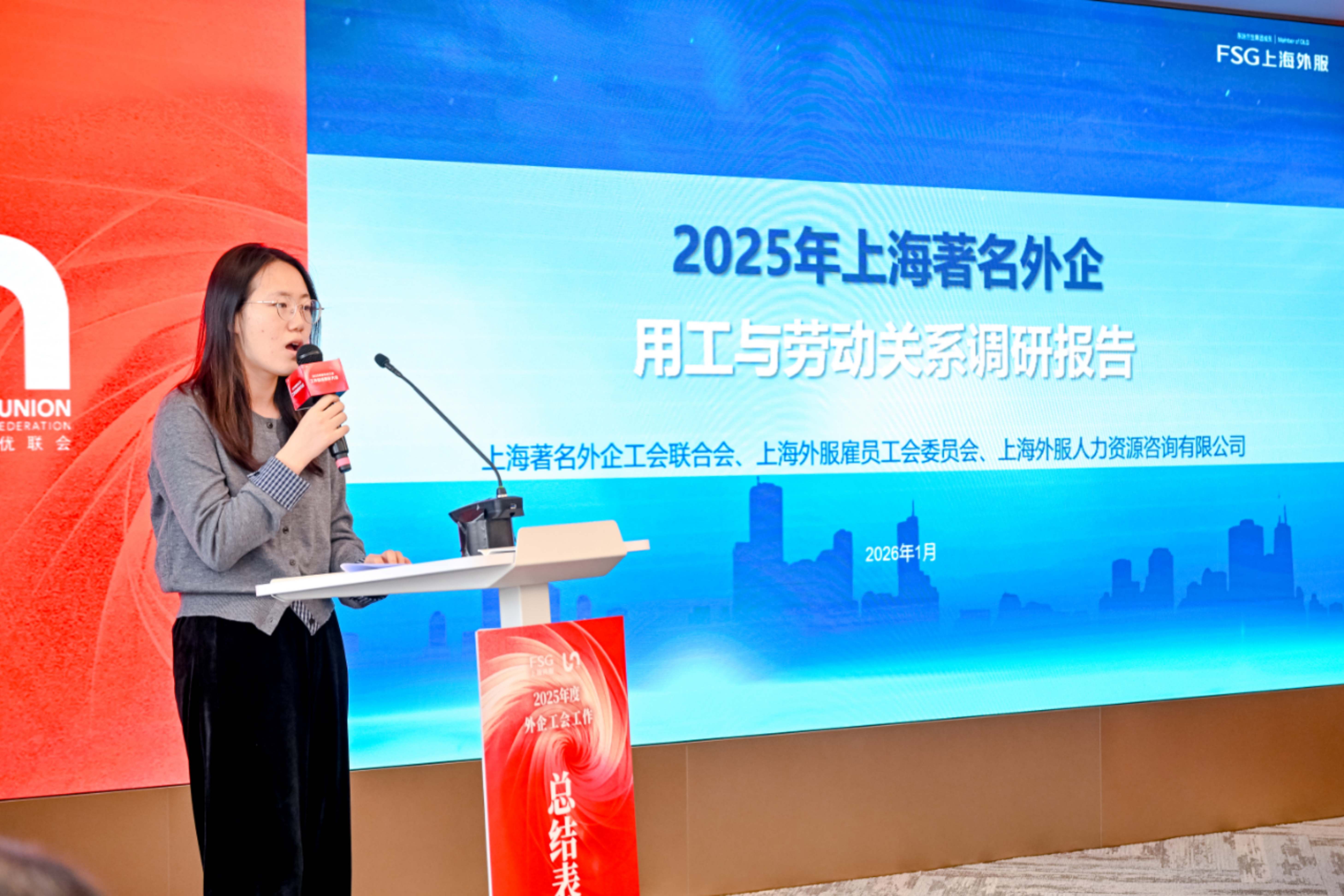 近日,2025年度外企工会工作总结表彰大会在绿地外滩中心隆重召开。现场,上海外服雇员工会工运主题宣传片《我们》首次发布,“勇攀高峰奖”“会聚她力奖”“工会技能之星”“工会火炬手”等先进集体与个人获得了表彰,《2025年上海著名外资企业用工与劳动关系调研报告》正式发布。