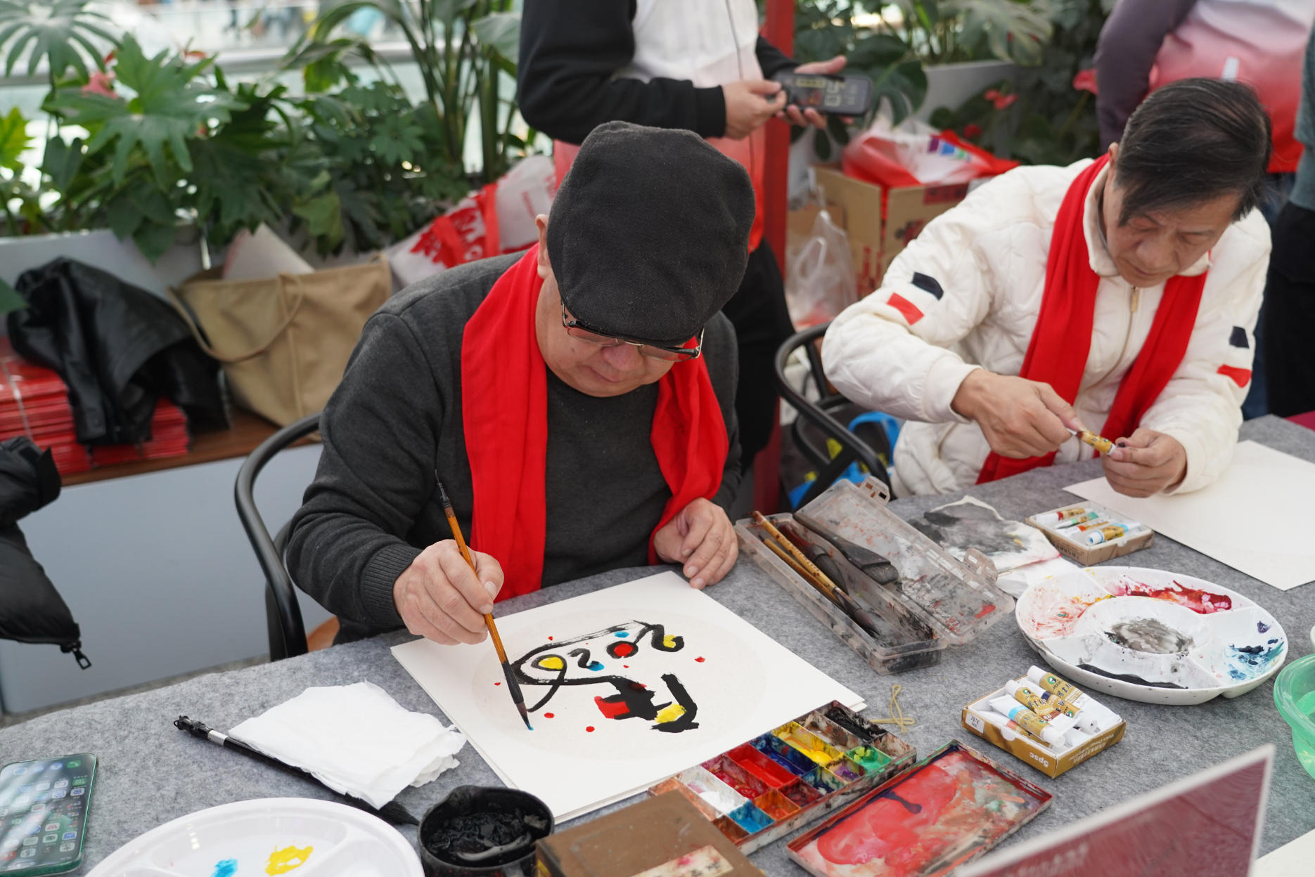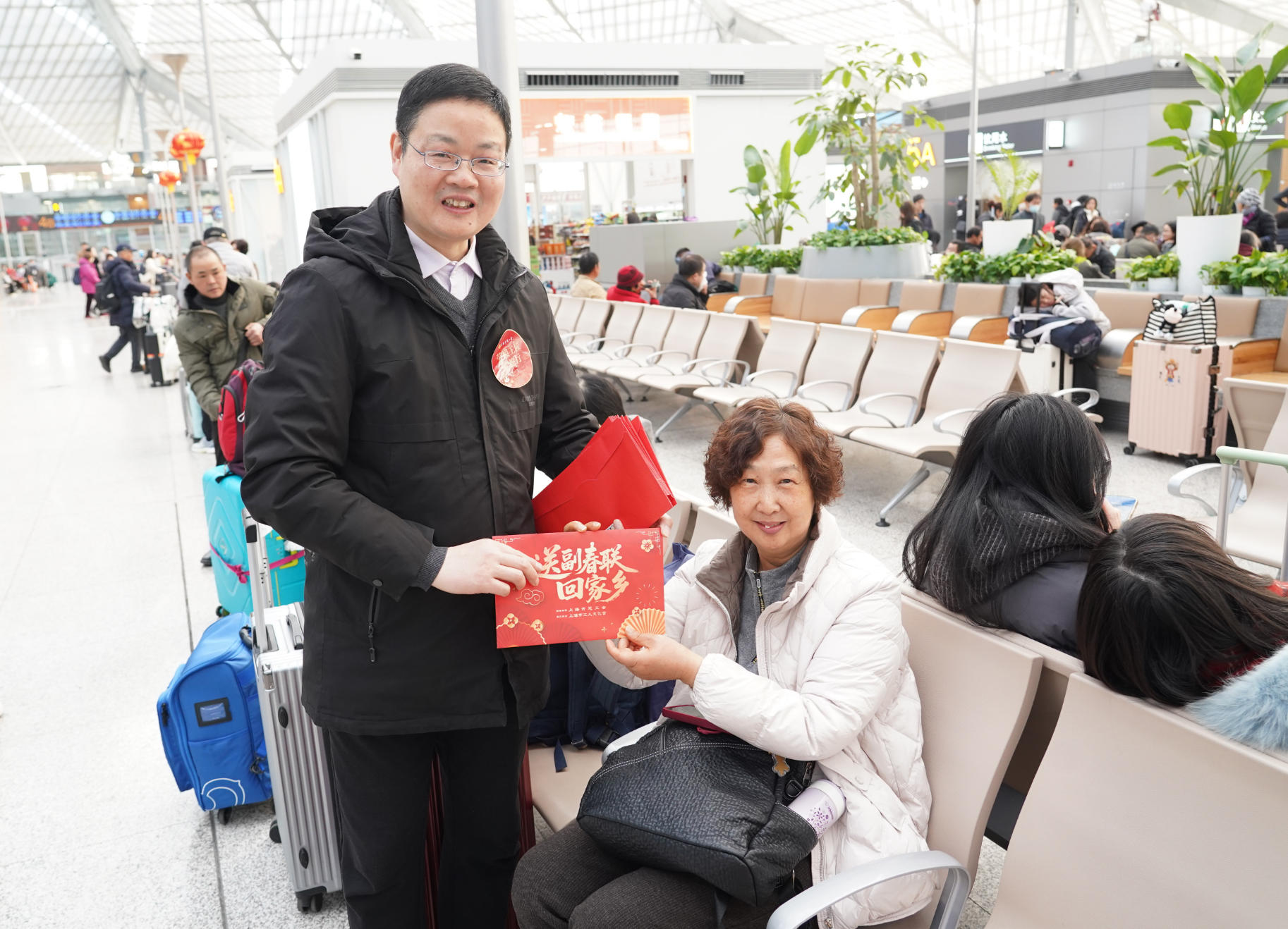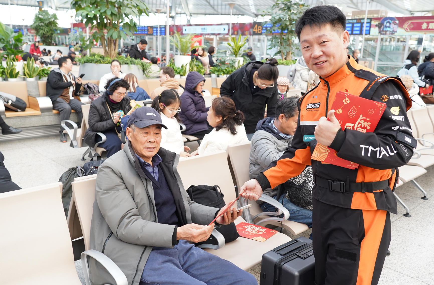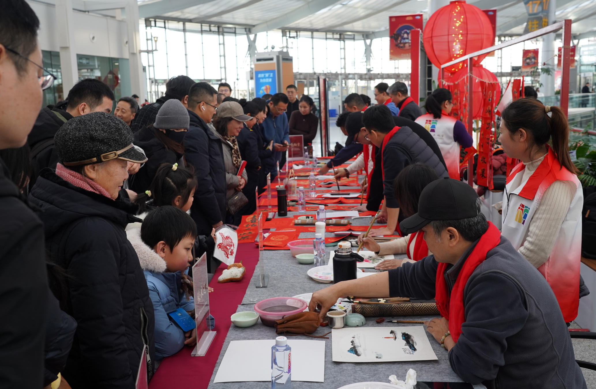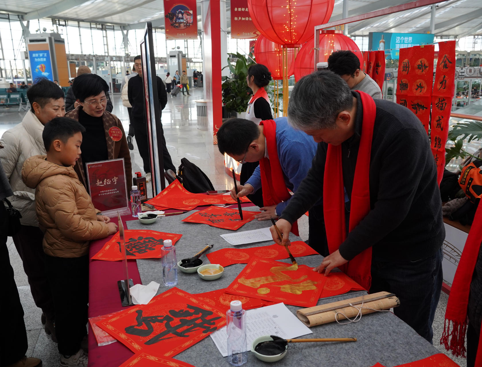 除了现场书写春联,活动还延续了往年暖心服务——劳模志愿者们主动走入候车人群,将一幅幅已精心装裱的春联和福字递到旅客手中。