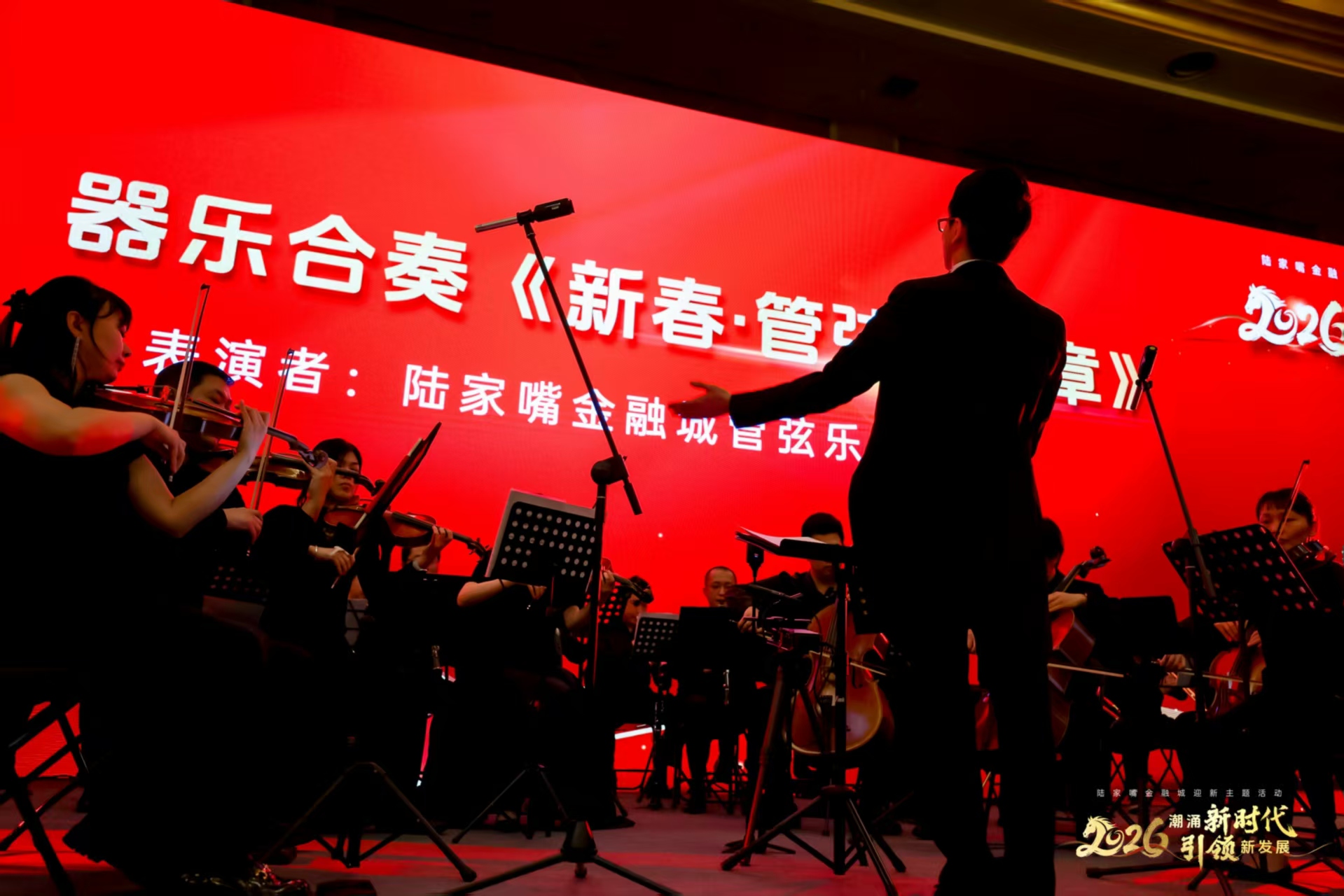 活动在陆家嘴金融城管弦乐团的《新春·管弦颂华章》中拉开序幕。激昂的旋律奏响了奋进的号角,也烘托出喜庆祥和的节日气氛。随后,上海自贸区陆家嘴管理局党组书记、局长,陆家嘴金融贸易区综合党委书记袁冶锋表示:“新的一年,陆家嘴金融城将聚焦固本强基与服务发展两条主线,继续在党建赋能中心工作上实现新突破,在营造活力人文生态上展现新作为,在升级党群服务阵地上取得新成效,奋力书写区域高质量发展新篇章。”