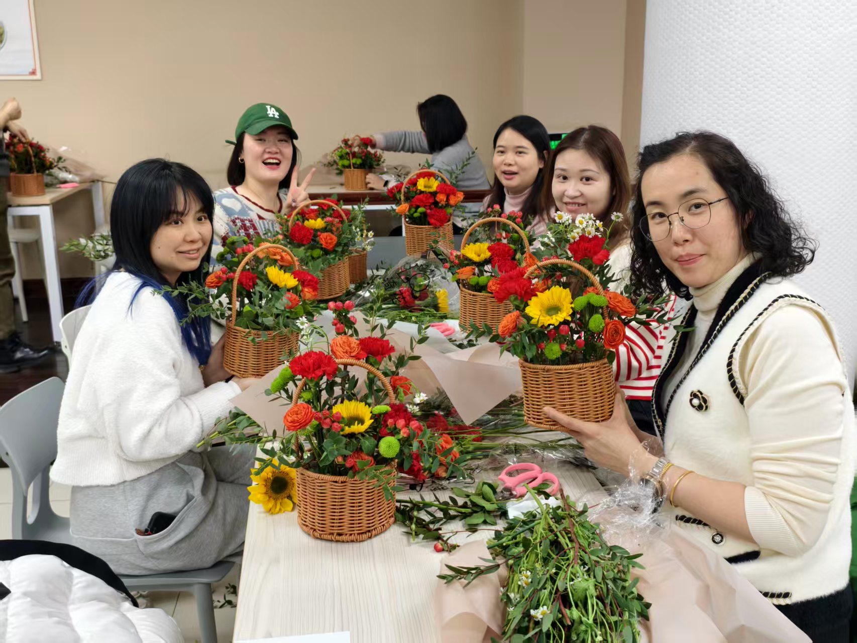 活动现场,专业花艺师从花材识别、色彩搭配、造型层次等方面进行深入浅出的讲解,并示范了插花的构图技法。大家边学边做、互帮互助,一双双平日里握手术刀、执记录笔的手轻拈花枝,将新春期许与美好祝福融入指尖。现场气氛轻松愉悦,一篮篮错落有致的花艺作品渐次绽放,鲜艳大气、满室生辉。大家纷纷表示,插花不仅让人在专注创作中舒缓压力,更增进了同事间的默契与情谊,增添了喜气洋洋的节日氛围。