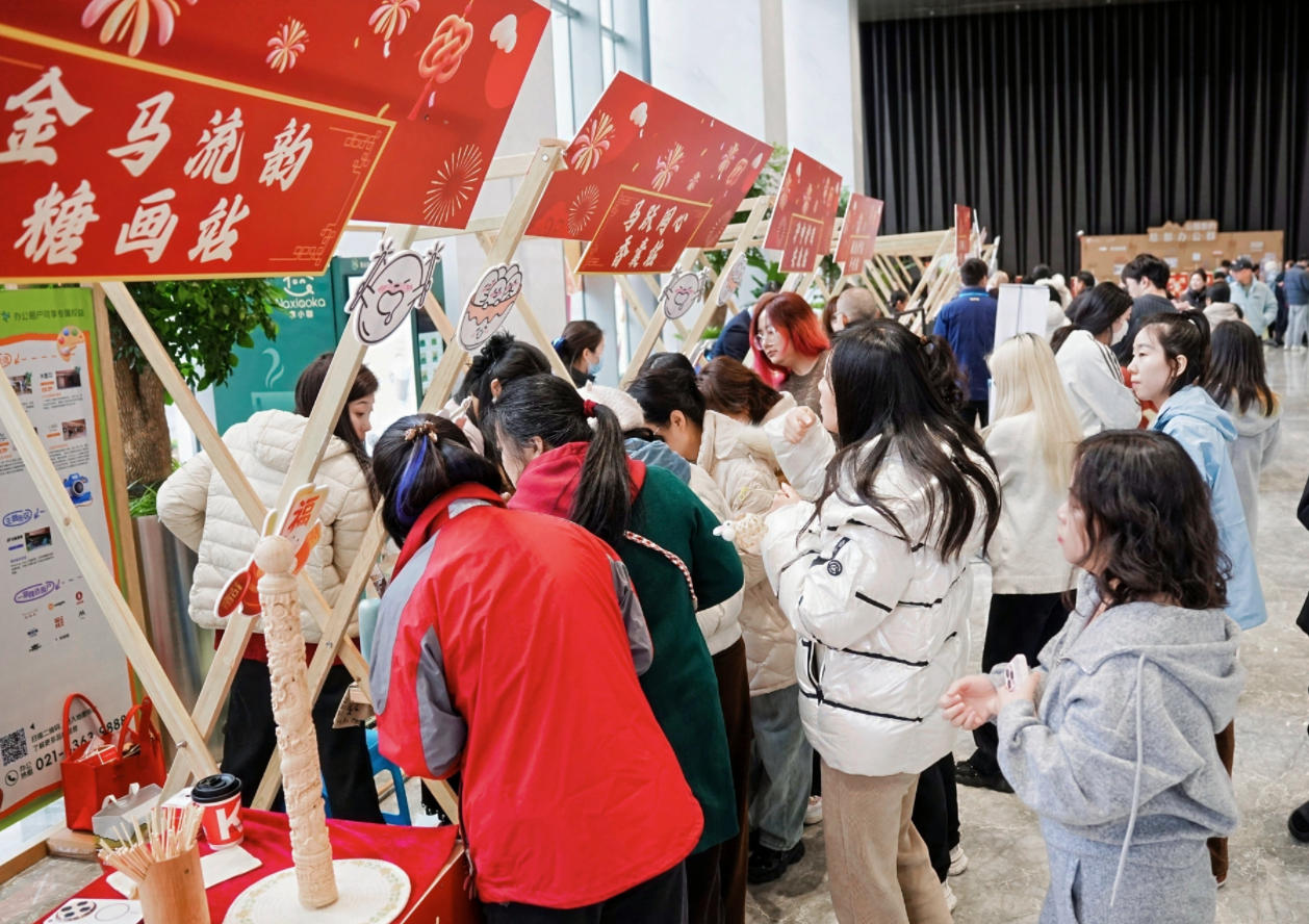 中午12点刚过,万科T3大堂内已是人头攒动。煮锅前热气升腾,工作人员将一碗碗汤圆递到楼宇白领手中。经典黑芝麻馅甜而不腻,鲜肉汤圆咸香适口,成为现场最受欢迎的口味。短短午间一小时,15斤汤圆便被一抢而空。活动设置了多个非遗民俗互动摊位,福气垫制作、窗花剪纸、套圈、踢毽球等传统游戏,引得楼宇白领、园区保安、保洁们也纷纷参与,欢声笑语此起彼伏。值得一提的是,赫法律师事务所设置的摊位颇具新意,将法律知识藏在灯谜里,吸引楼宇职工边玩边学。几位外国员工被热闹氛围吸引,驻足观看剪纸、拓印,连连赞叹:“哦!这就是中国的年!”