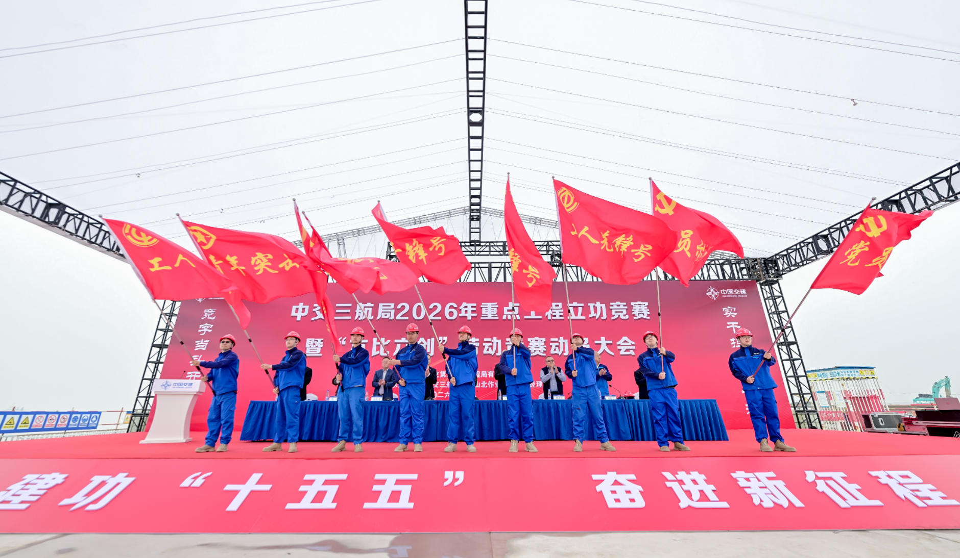 会上总结了2025年度立功竞赛活动并部署2026年竞赛工作。现场表彰中交三航局2025年度立功竞赛活动各类先进和2025年度文明工地代表。主席台领导向党员突击队、工人先锋号、青年突击队授旗。全体成员进行现场宣誓。一公司、三公司、小洋山北项目总经理部作为参赛单位代表与三航局竞赛领导小组签订了协议。