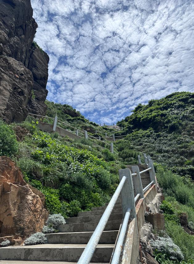 初次登岛,立刻被秀美的山崖风景和岛中央一道长石梯吸引住目光,同时也感受到毒辣的阳光扫射到头顶。从石梯拾级而上,灯塔工人龚兵、张春华介绍起了他们的工作。